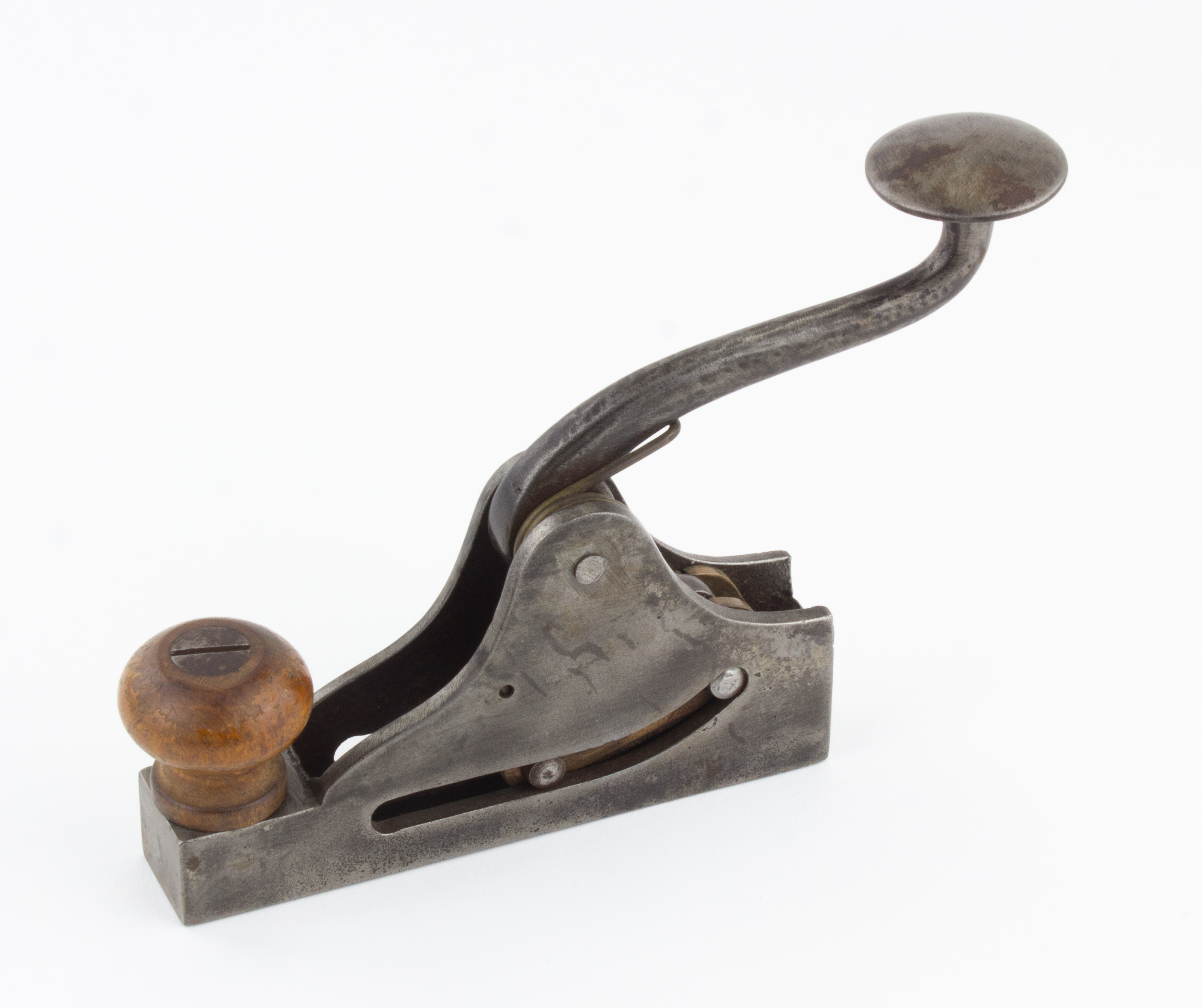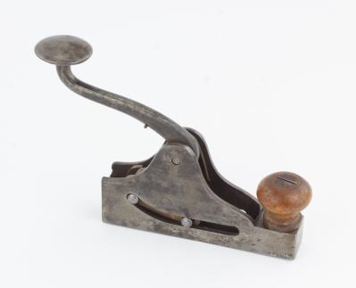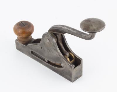 B67-652 BLIND NAILING PLANE. Stranahan Patent. Resembles the examples in PTAMPIA II, page 118, but the arm protrudes to the rear rather than the front and matches the original patent drawing, so possibly a very early version. Marked with 7/20/86 patent date on one cheek for William Stranahan of Minneapolis, but no one knows who made or sold them. Metal clean with traces of oxidation, wooden knob has light wear. Works smoothly. From the collection of Harold Unruh. Good+ 300-600