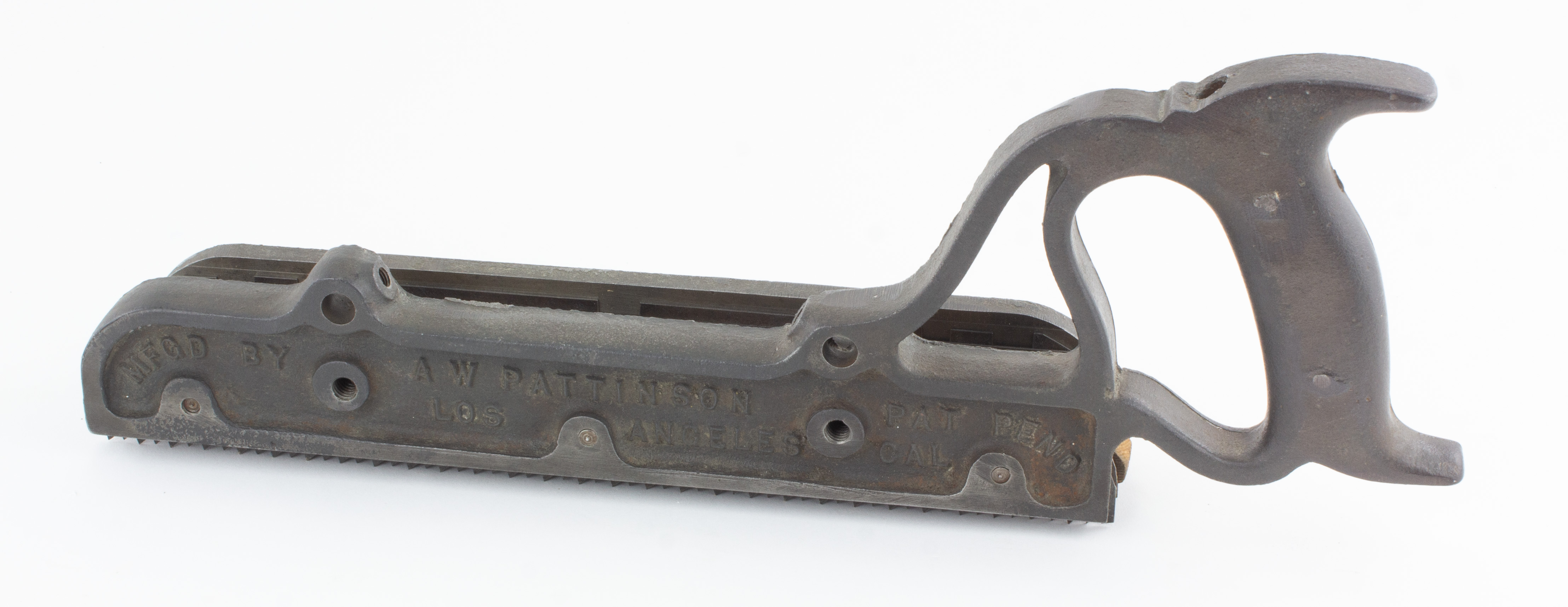 B67-655 SAW TOOTH PLANE. A.W. Pattinson. Has two 11-1/2" saw tooth blades with wood slats between them, cast iron body has "A.W. Pattinson, Los Angeles, Patent Pending" cast into it. Also has A242 stamped into frame. One side has four threaded holes tapped into body and fence which could have held another part. Overall clean. Very unusual. From the collection of Harold Unruh. Good 125-250