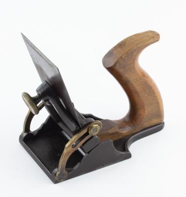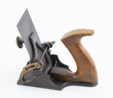 B67-656 PATENTED SCRAPER PLANE. J. Jones. Patented by Joseph Jones of Newark in 1873. See PTAMPIA I, Figure 179. Tilting blade with brass arms, beech handle has light wear, japanning near complete, unmarked cutter has surface rust. Uncommon. From the collection of Harold Unruh. Good+ 1000-2000