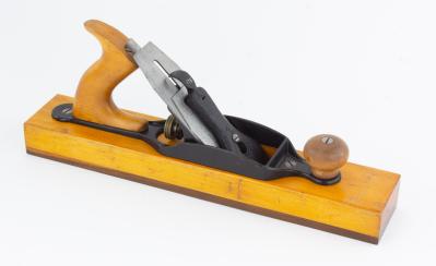 B67-661 TRANSITIONAL JACK PLANE. Stanley Model Shop. 15" long with rosewood sole attached ot the body with fingerjoints, 1892 patent date cutter, unmarked at toe. Has model shop number 175 on lever cap, the rosewood sole is presumably the feature they were experimenting with. Overall clean with mild wear to wood. From the collection of Paul Van Pernis. Fine 500-1000