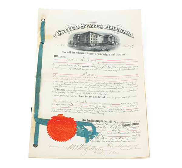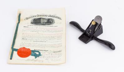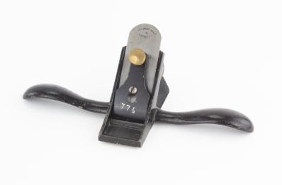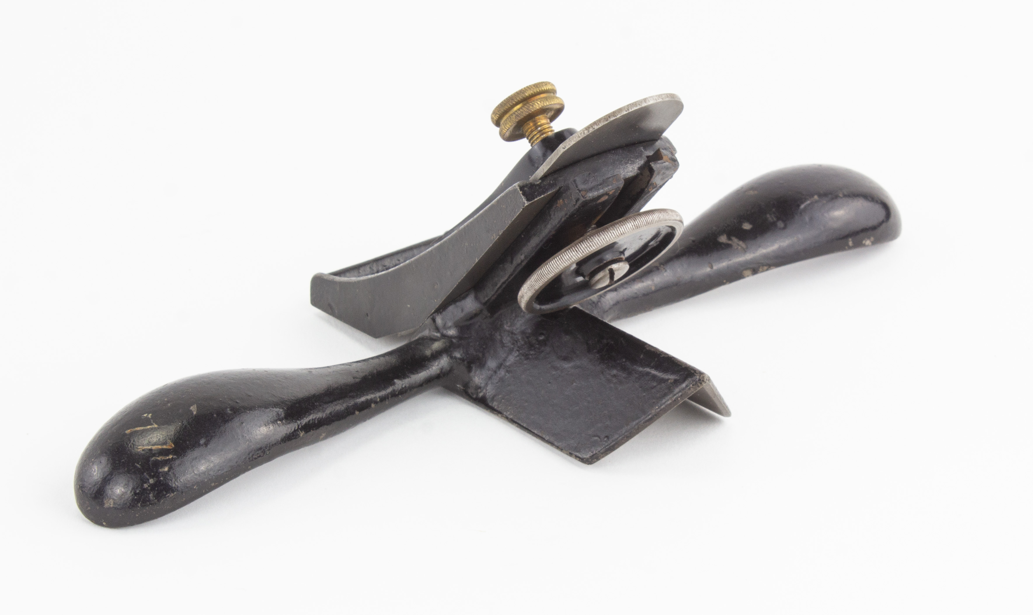 B67-662 PROTOTYPE CHAMFER SHAVE. Justus Traut Patent. With the original patent papers. Traut's patent No. 316079, which was the basis for the No. 72 chamfer plane, actually described a shave using the same mechanism subsequently used in the plane. The shave version was never put into production, but this one matches the patent exactly. Marked with model shop number 776 and has an original Stanley cutter. Japanning nearly complete. Probably the only one ever made. From the collection of Paul Van Pernis. Fine 4000-8000