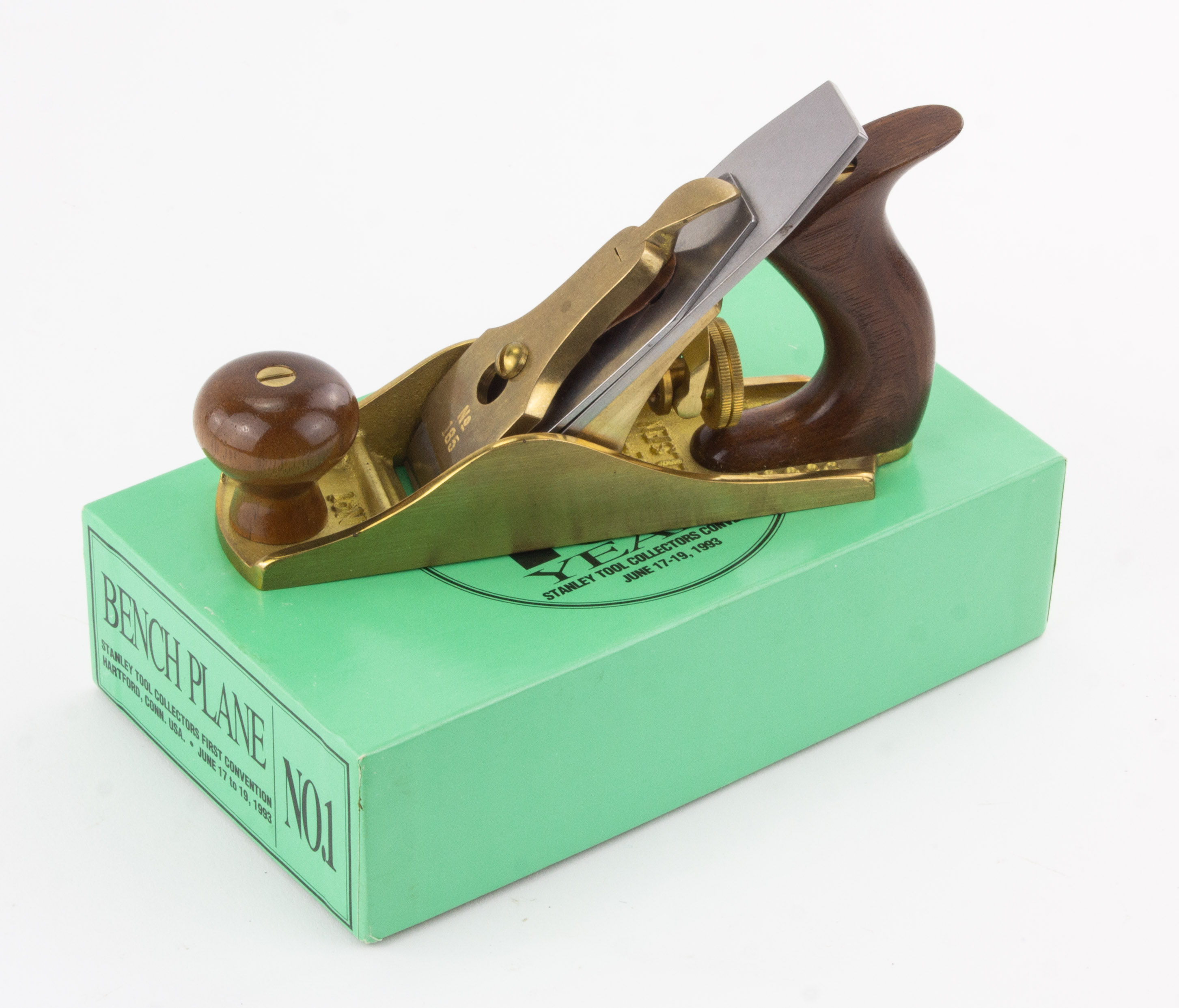 B67-671 MODERN PLANE. Stanley No. 1 Replica. No. 185 of a numbered series of 250 produced by Lie-Nielsen in collaboration with the Fine Tool Journal to commemorate the first Stanley Tool Collectors Convention in 1993. Brass body with cherry knob and tote. Mint in original box (one split seam) with original paperwork. From the collection of Harold Unruh. Fine 400-800
