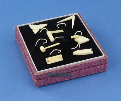 B67-681 SET OF MINIATURE IVORY MASON'S TOOLS. Trowel, two plumb boards, square, mallet, calipers and folding rule. The two plumb boards don't have working bobs, but the calipers and folding rule work. Unsigned but beautifully made in 4-1/2" square box, held by loops. From the collection of David Jeffers. Fine 120-240