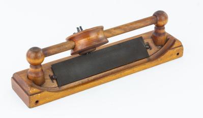B67-682 PENCIL SHARPENER. Perfect Pencil Pointer. Patented in 1890 and manufactured for about 20 years by the Goodell Co. in Antrim, NH; you insert the pencil into a wooden collar and rotate it against a file. Label on the base is tattered and mostly illegible, but otherwise intact. One of the iconic early pencil sharpener designs. From the collection of Jim and Christa Schoenky. Good+ 100-200