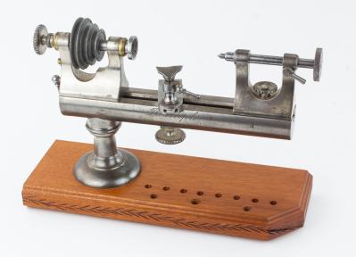 B67-688 WATCHMAKER'S LATHE. Lorch "Triumph." 11-1/2" long and 8" high, complete with headstock with pulleys, sliding tailstock and tool rest. Polish worn, but complete and works smoothly. Mounted on an oak base with holes for different collets, not included. "Triumph" engraved in script on the side, which was a brand manufactured by the Geneva firm of Lorch, Schmidt & Co. Good+ 200-400