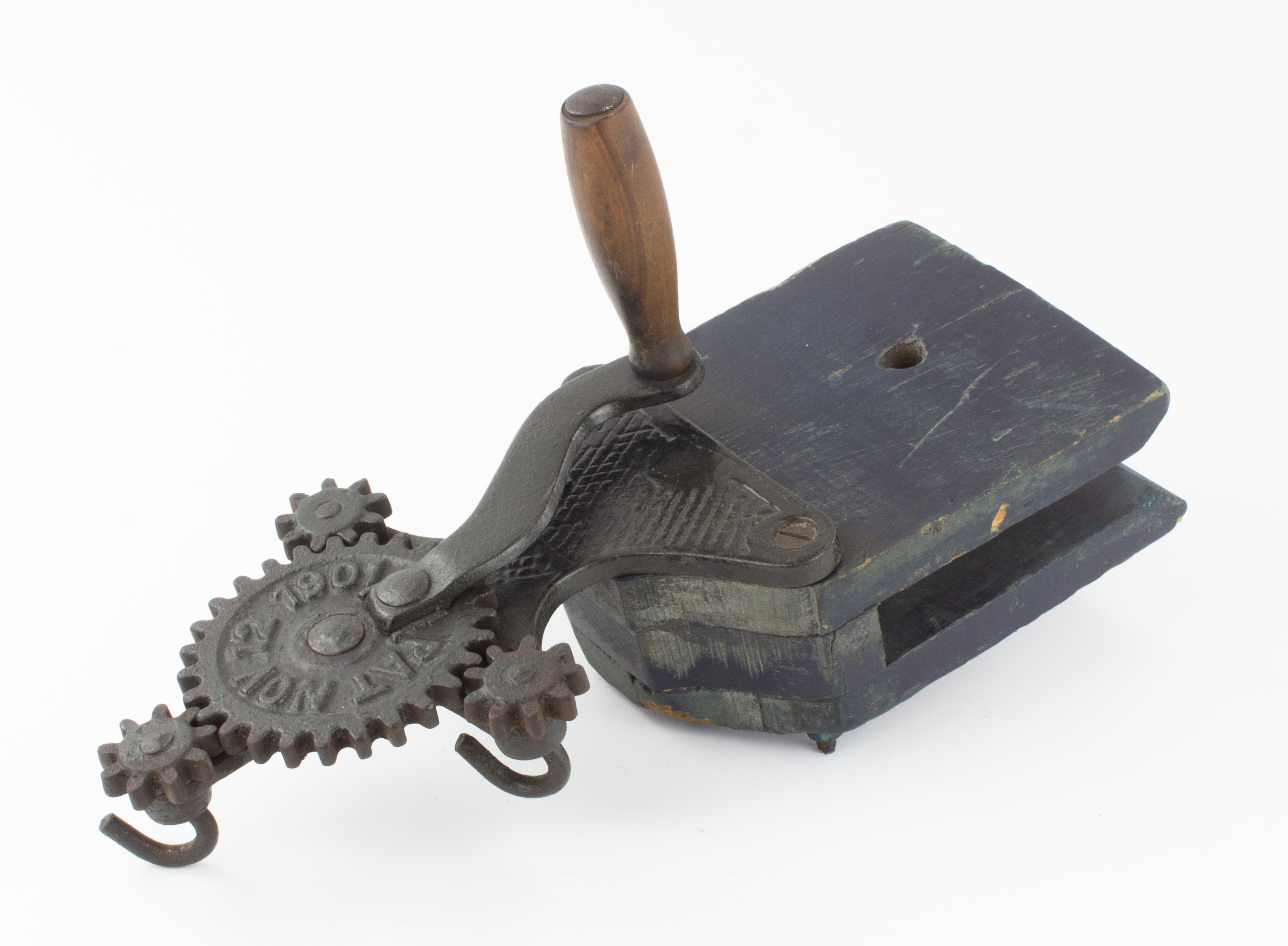 B67-697 ROPE WINDER. Bucklin Patent. Three strand winder with a gear driven crank. Patented by Orson Bucklin of Marietta, MN, but marked only with the 11/12/01 patent date. 8-1/2" high, bolted to a piece of black painted wood that adds an additional 4". Clean and rust free, works smoothly. From the collection of David Jeffers. Fine 120-240