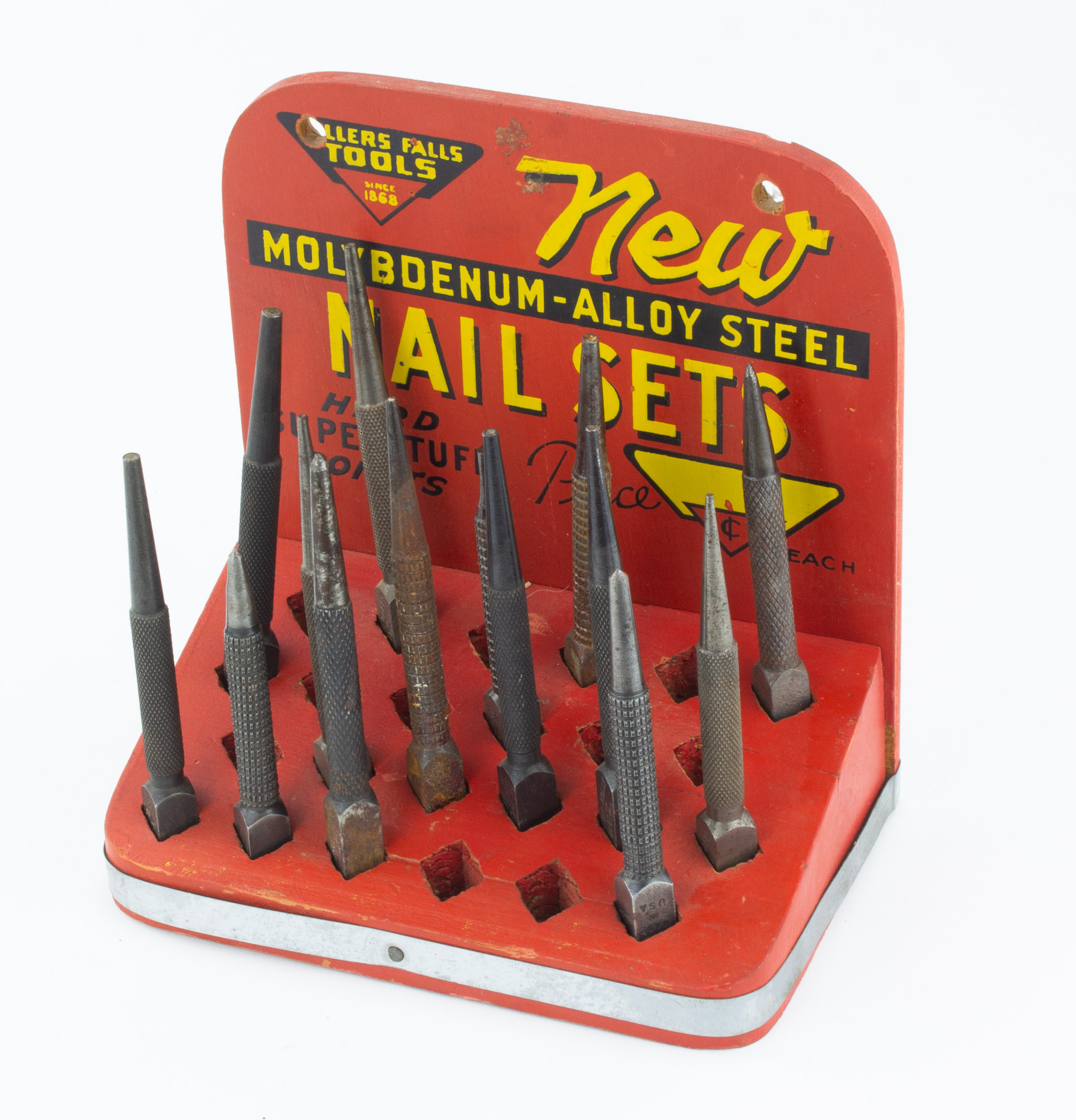 B67-698 POINT OF SALE DISPLAY. Millers Falls Nail Sets. 6" by 4" and 6-1/2" tall, holes for wall hanging or can sit on the counter. 24 holes for nail sets, with 14 actual sets of different sizes, all but one marked by MF. Paint is clean and complete; there's a metal band around the base of the display that has broken at the end; we'll leave it to the buyer to refasten it. Most of the sets are clean and like new, a couple have some rust. From the collection of Jim and Christa Schoenky. Good+ 150-300
