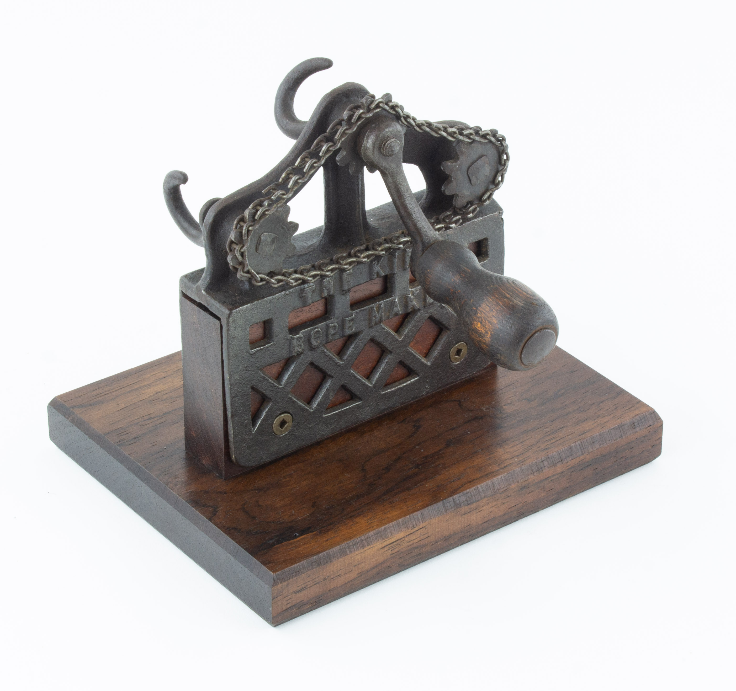 B67-699 ROPE MAKER. "The King." Patented in 1910 by Thomas McIntosh of Fairfield, IA, consists of three hooks linked together by a chain drive. Mounted on a 5-1/2" by 7" rosewood base, and 6" high, with the name and patent information cast into the sides. Clean and works smoothly. From the collection of David Jeffers. Fine 100-200