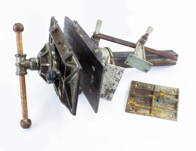 B67-701 PATTERNMAKER'S VISE. Emmert No. K1. Type U4 of the "universal improved" version of the Emmert vise patented by Victor Koontz in 1919. 18" wide jaws, 28" long including the tilting bar. Plating is worn, but complete and working with all its parts including an extra pivoting jaw piece. Good+ 500-1000