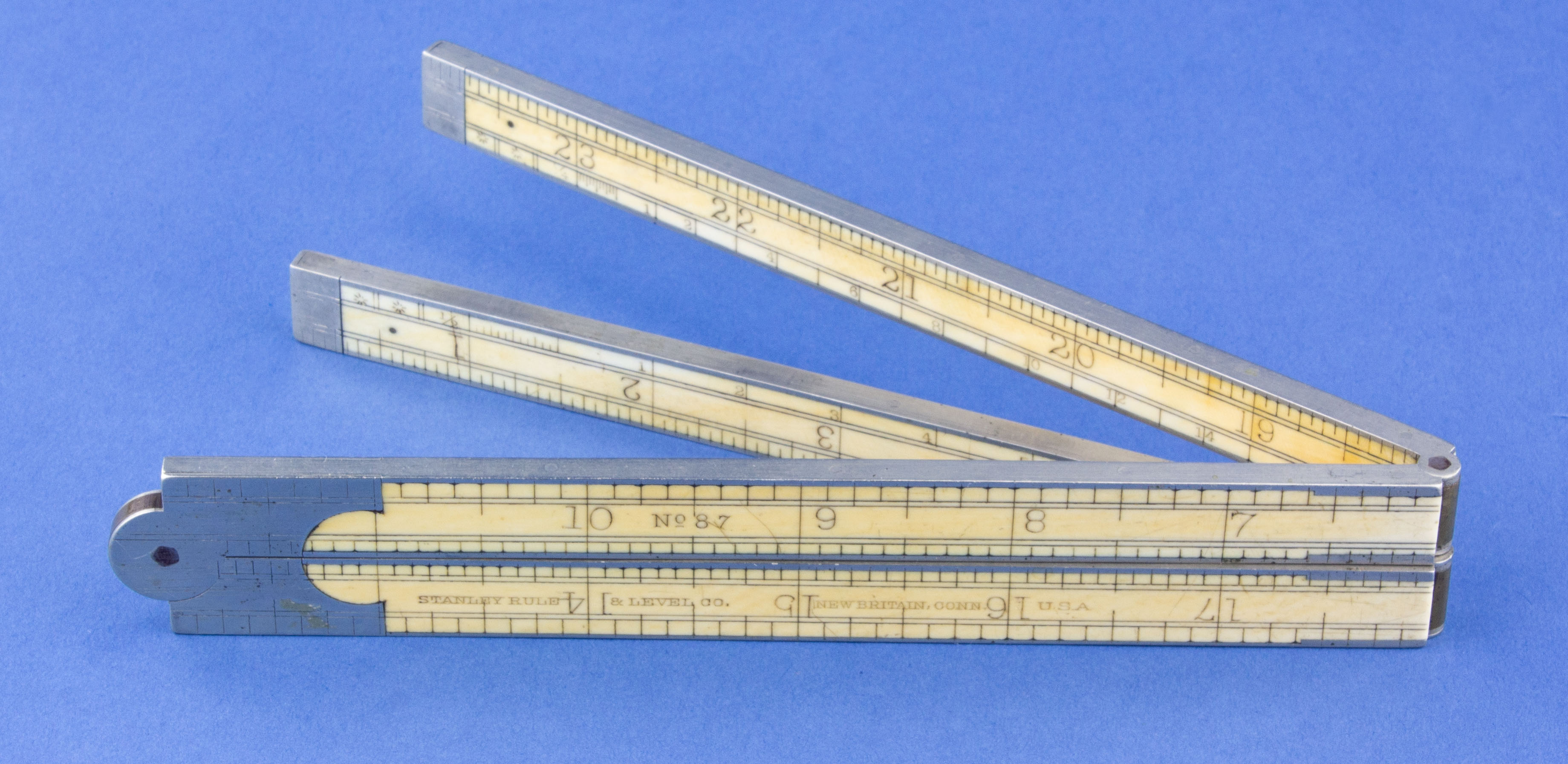 B67-708 CARPENTER'S IVORY RULE. Stanley No. 87. Fourfold, two-foot, fully German silver bound. Marked by Stanley on a single line. Lightly browned, primarily on the outer faces, with a couple of scratches; straight and tight but missing pins. From the collection of David Jeffers. Good+ 150-300