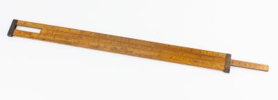 B67-713 CUSTOMS CUBING RULE. Henry Hughes & Son. Based on E.A.P. Burt's 1887 patent, a Coggeshall type slide rule used by British customs & excise to measure the volume of irregularly shaped timber and stone in cubic feet. Boxwood, 24" long, marked "British Customs Standard Cubing Rule," also marked with Burt's patent information and Hughes as the maker. Some superficial scratches but no damage, all scales clear. Good+ 150-300