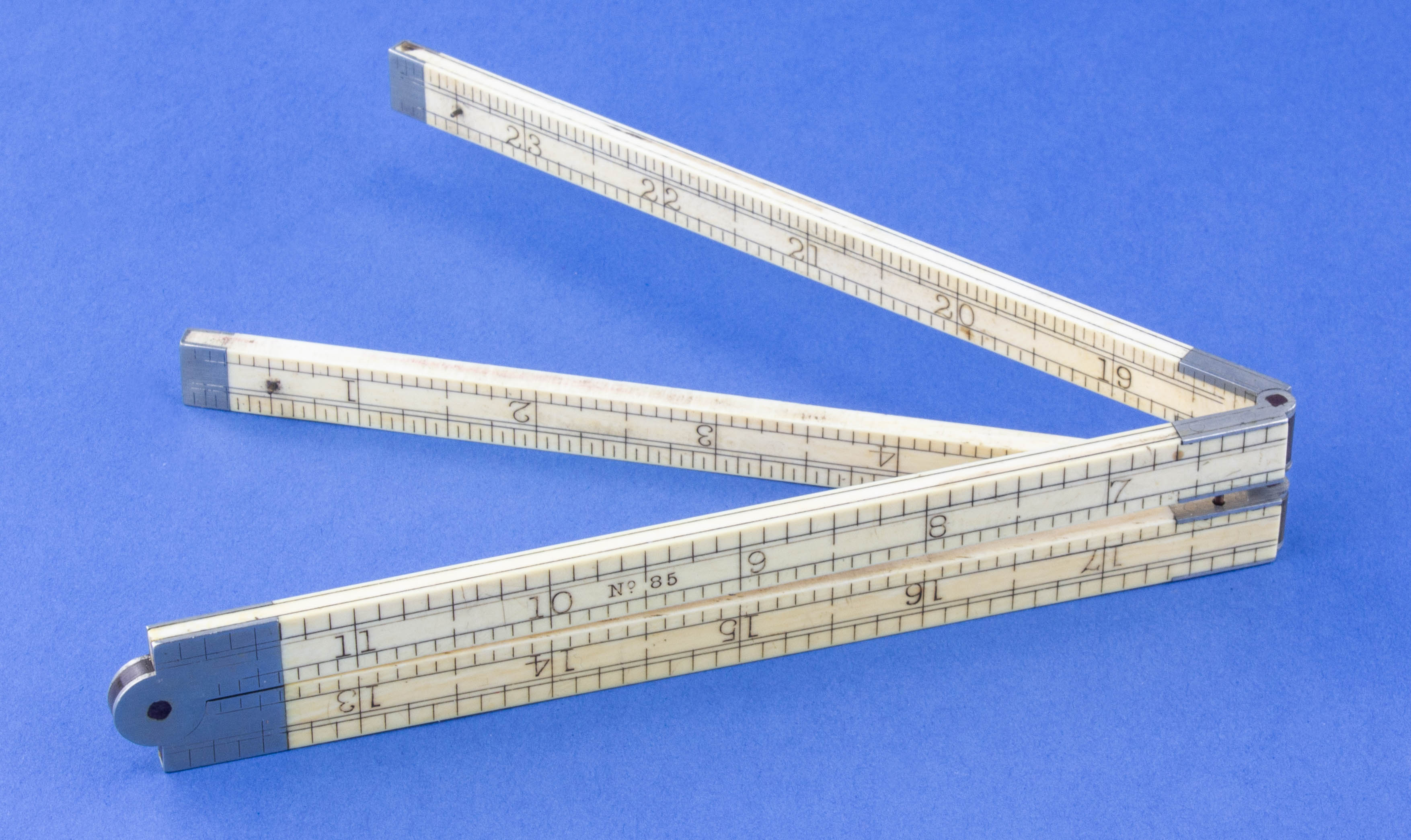 B67-720 IVORY CARPENTER'S RULE. Stanley No. 85. Fourfold, two-foot, unbound, square German silver hinge. Two-line Stanley mark. Very lightly yellowed, straight and tight. From the collection of David Jeffers. Fine 200-400