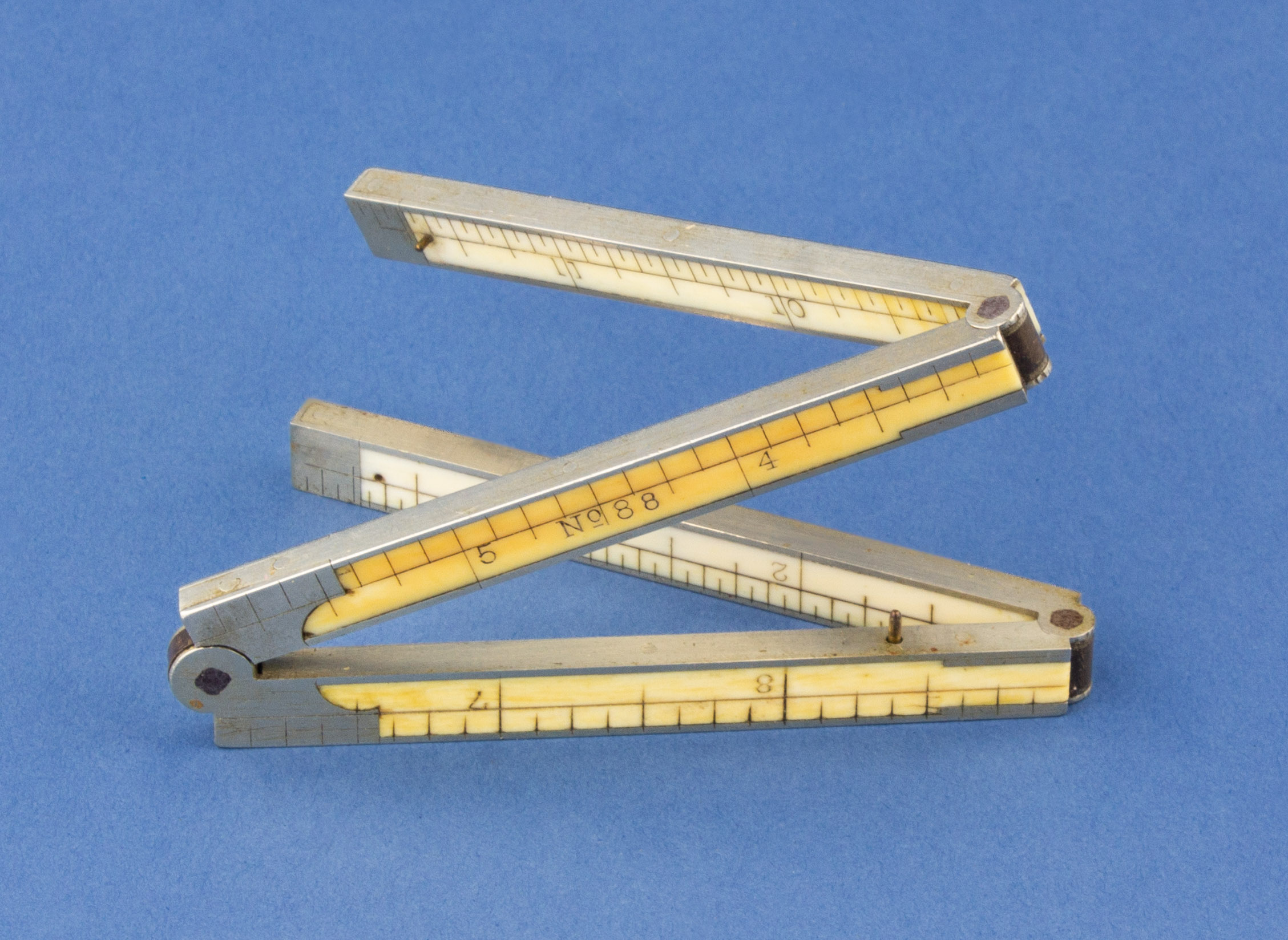 B67-723 IVORY FOLDING RULE. Stanley No. 88. Fourfold, one-foot, narrow, German silver bound. Not marked by Stanley. Inner faces very clean, outer lightly yellowed. Missing one face pin. From the collection of David Jeffers. Good+ 100-200