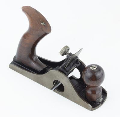 B67-730 TILT-HANDLE CABINET SCRAPER. Stanley No. 85. Type 3 with old style cap screw, cutter is marked Keen Kutter. Japanning 99%, wood and metal very clean noting a small chip in the throat. Good+ 200-400