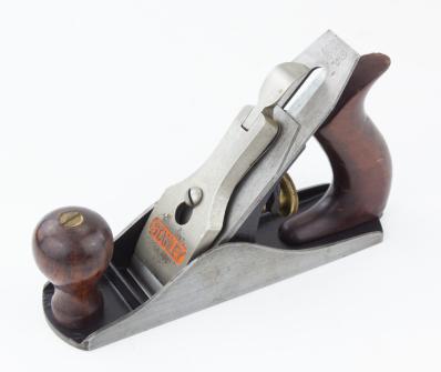 B67-731 NUMBER TWO SIZE PLANE. Stanley No. 2. Late type with orange lever cap and notched rectangle cutter, japanning 98%, nickel plating on lever cap 90%. Wood has a few nicks at tip of tote otherwise very clean. Good+ 150-300