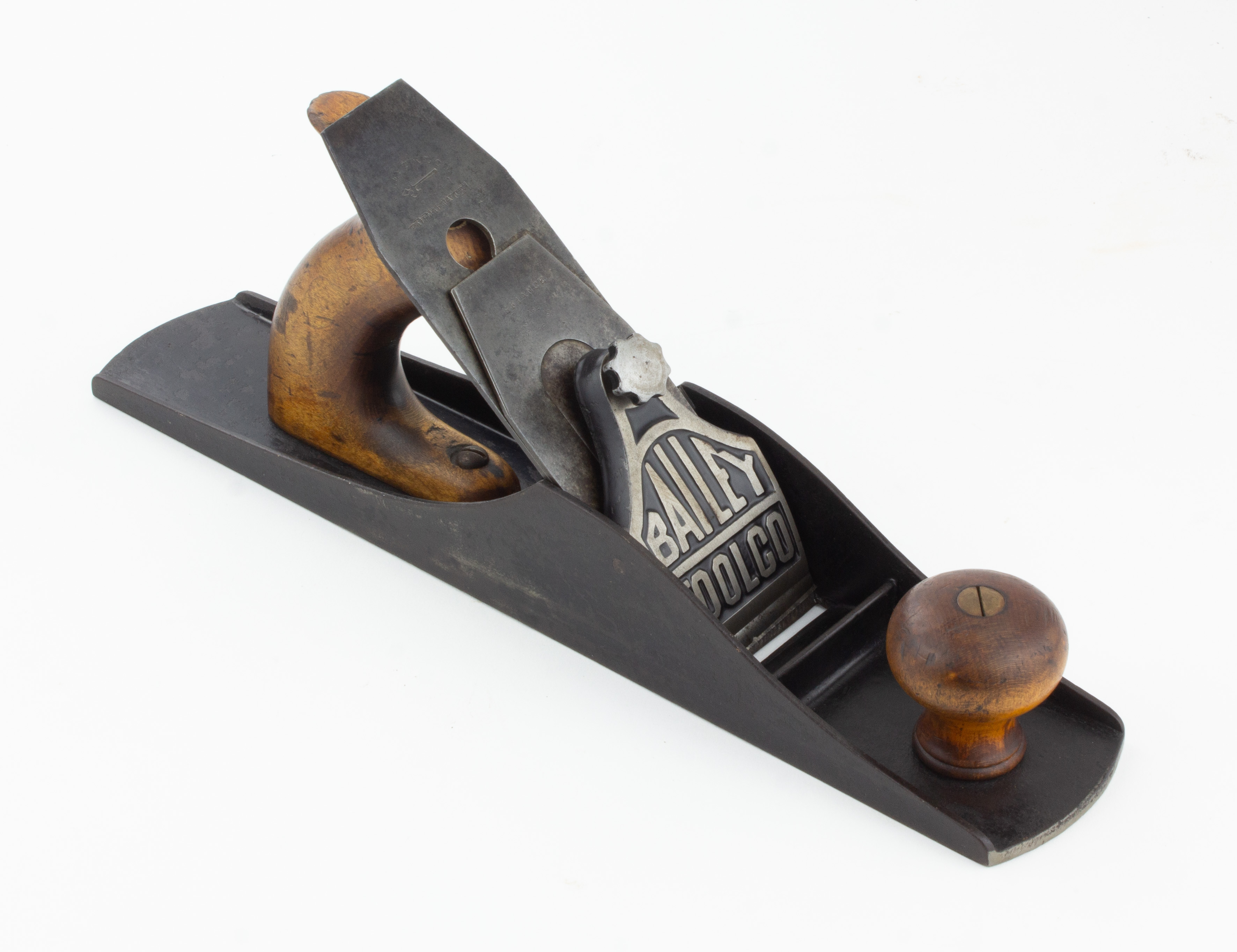 B67-753 JACK PLANE. Bailey Tool Co. Defiance No. 25. 13" sole, Bailey Tool Co. cast into lever cap, japanning 50%, original marked cutter. Wood has light wear. The non-adjustable versions of Bailey's bench planes are the least common. From the collection of Harold Unruh. Good 125-250