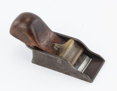 B67-756 LOW ANGLE BLOCK PLANE. Cast iron body with 3-1/2", 1-1/4" unmarked iron, mahogany wedge with bulbous end and decorative scalloped edge, pivoting gunmetal bridge. It has the name "J. Washburn" engraved in script on the left cheek, presumably the talented maker. Light surface oxidation but no damage. Good+ 120-240