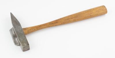 B67-760 TINNER'S HAMMER. A.T. Nelson. Patented July 28, 1903, and designed for use by tinners with flange to facilitate use on tin roofs. 5-1/2" wide head, nickel plating 90%, clearly marked with patent information. 10" original handle. From the collection of David Jeffers. Good+ 75-150