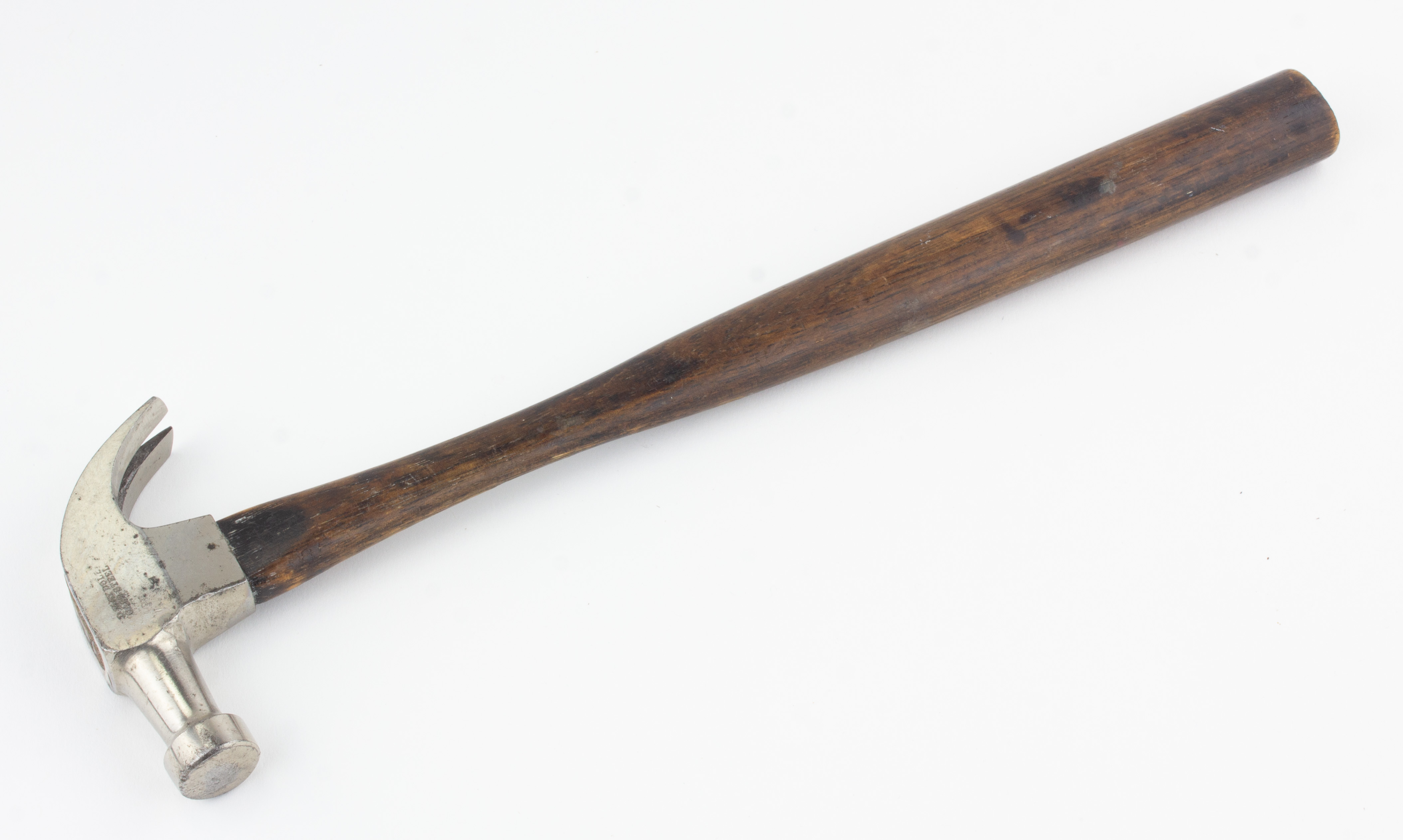 B67-762 SMALL CLAW HAMMER. Maydole. 3-1/2" long head, nickel plated, 10-3/8" handle looks ebonized and worn. Not sure if this was decorative or for delicate use but is well made. From the collection of David Jeffers. Good+ 50-100