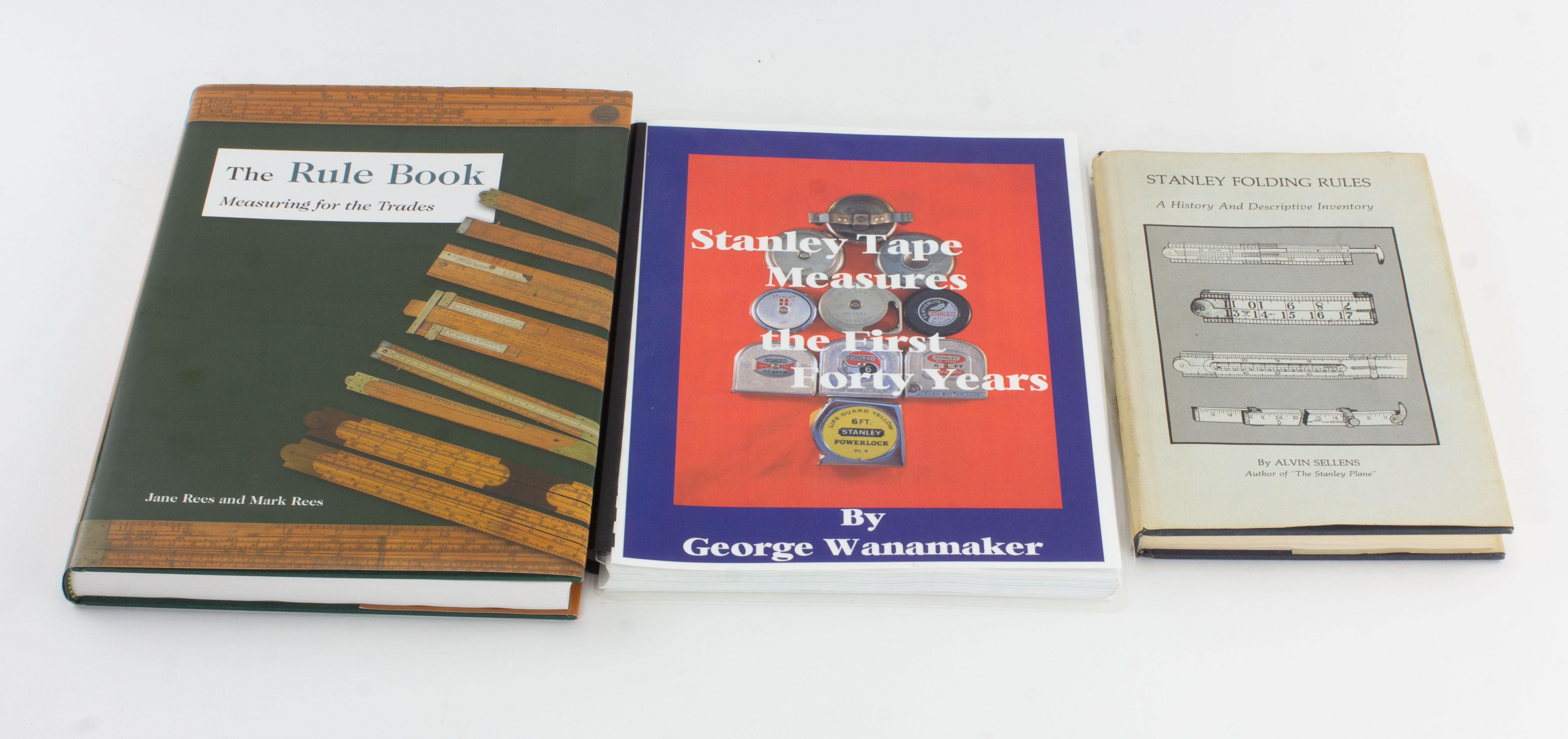B67-770 LOT OF THREE MEASURING TOOL REFERENCE BOOKS. Stanley Folding Rules by Alvin Sellens, Stanley Tape Measures by George Wanamaker (signed by author), and The Rule Book by Jane & Mark Rees. Moderate wear to dustjacket of Sellens, other two are clean. From the collection of David Jeffers. Good & better 100-200