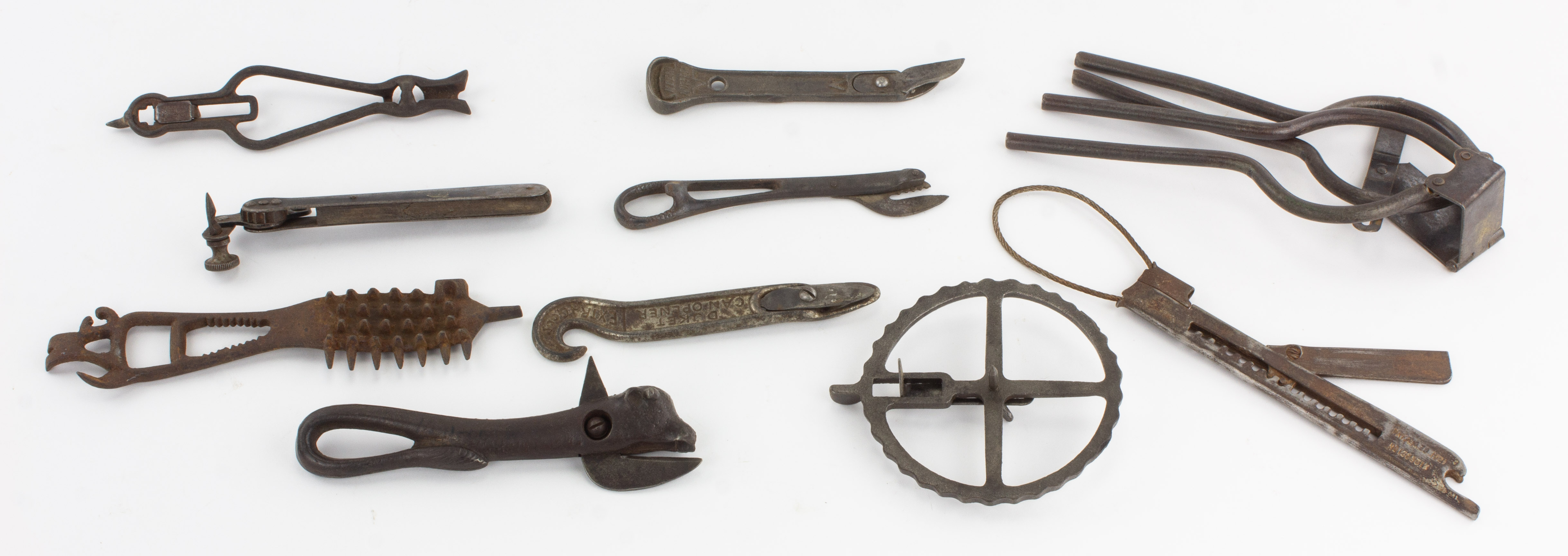 B67-778 DEALER LOT OF CAN OPENERS. Ten total of varying types, marked with either patent dates or makers including Keen Kutter, Unconquerable, Girard McIntosh, Peerless, Safety First, Duket, plus two unmarked, one with multi-tool end and spiked head and one with a head in the shape of a cow. A few with some spots of surface rust, most function well. As is, no returns. Good & better 150-300