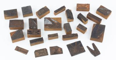 B67-781 DEALER LOT OF PRINTING STAMPS. Twenty-five total depicting various machinery and hand tools including Millers Falls bit braces, Planet Jr., Waird and Hussey plows, Stearns edger, tractor, washing machine, wagon, clippers, snips, hack saws, and hatchet. Several without wood backing but majority have good wooden backs. Mild wear to some. As is, no returns. Good & better 100-200