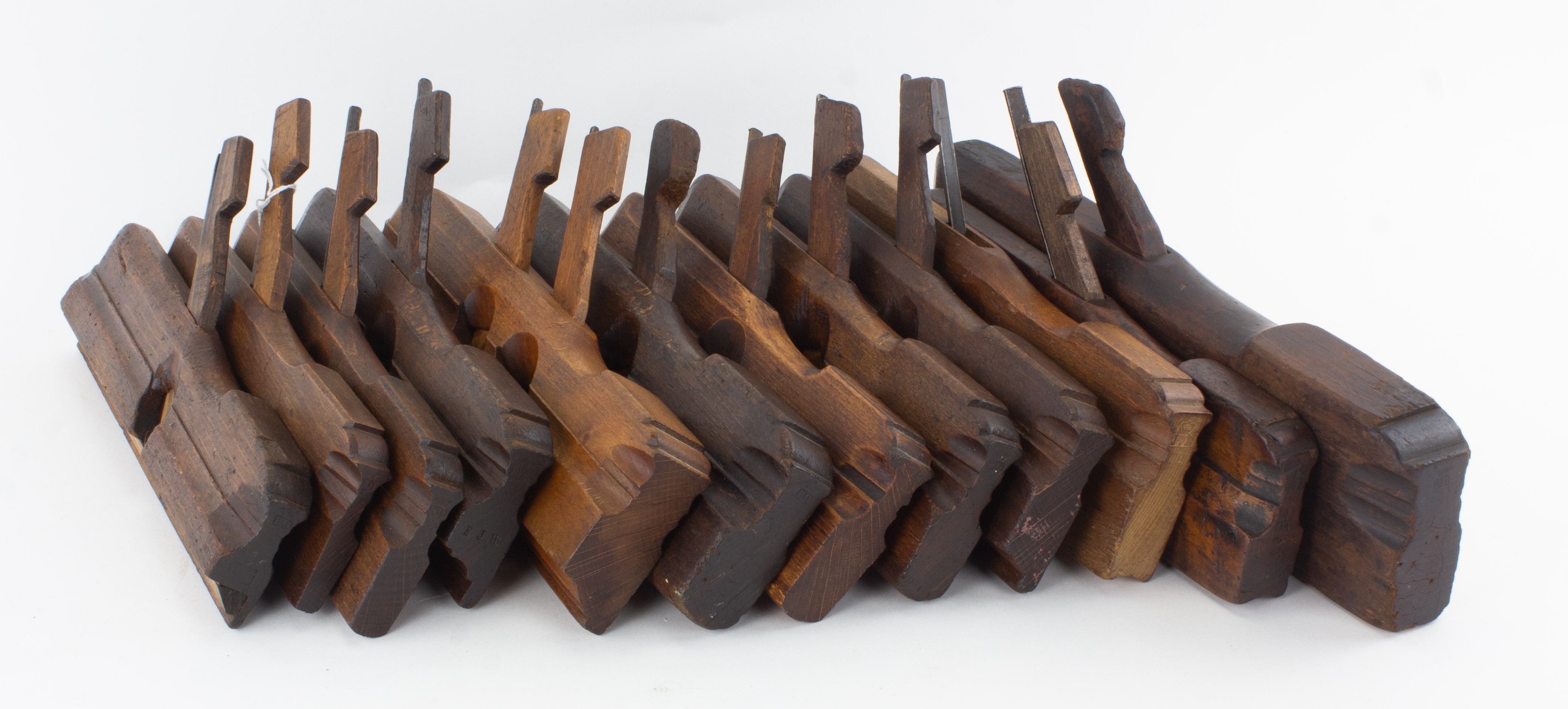 B67-784 DEALER LOT OF DUTCH MOLDING PLANES. Twelve total, most marked PD with crown on toe, two marked JN, one has double cutters. One is missing wedge. Profiles include hollows, rounds, rabbets, and a few with complex ogee cuts. Overall wear and chewing to wedges on some. As is, no returns. Good 100-200