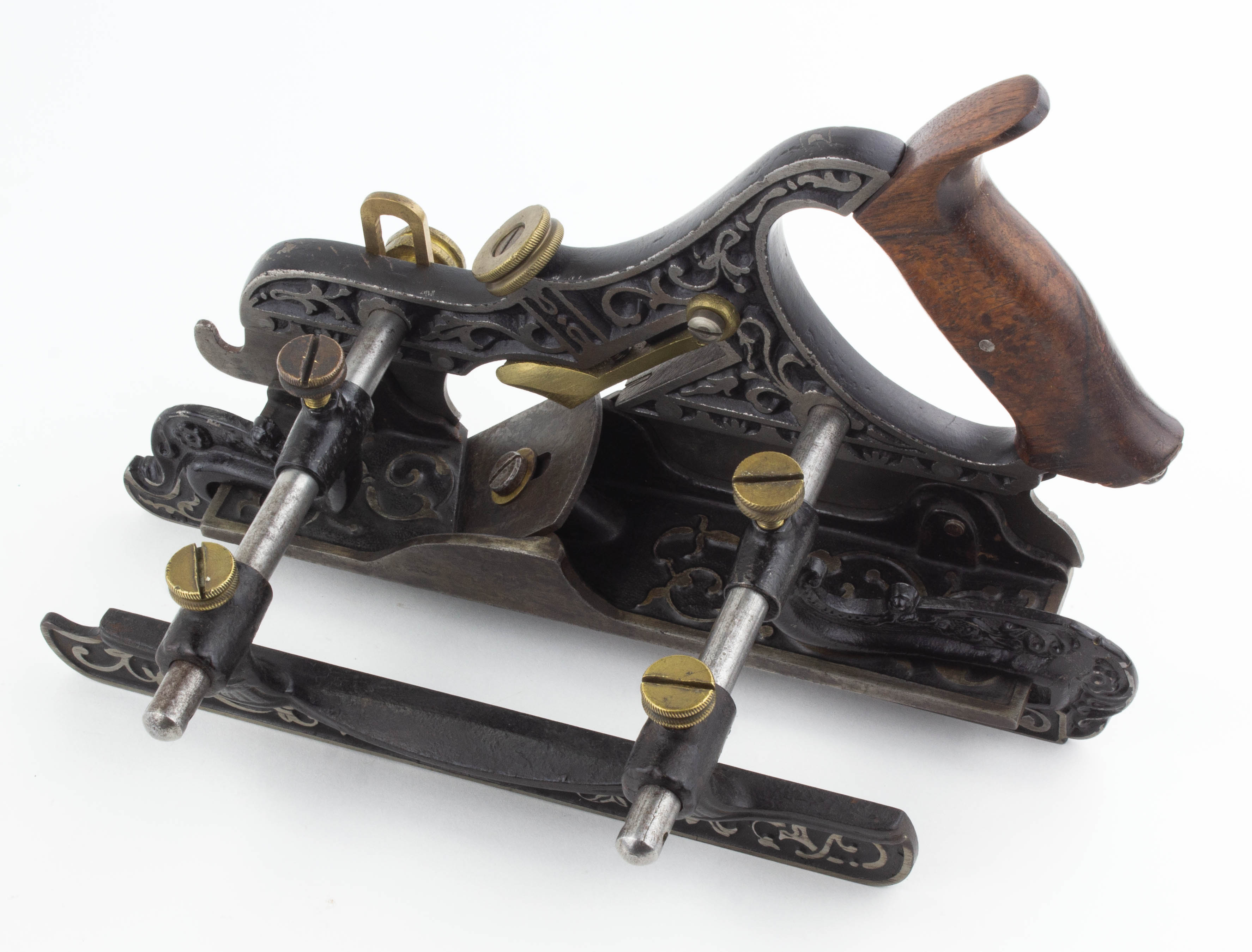 B68-5 MILLER'S PATENT COMBINATION PLANE. Stanley No. 41. Type 3, includes both fences and filletster bed. One small crack around rear skate rivet, nearly invisible repair to tip of tote. Depth stop locking screw is squared, otherwise very clean. Braised repair on wraparound fence. From the collection of Jim and Becky Leamy. Good- 250-500
