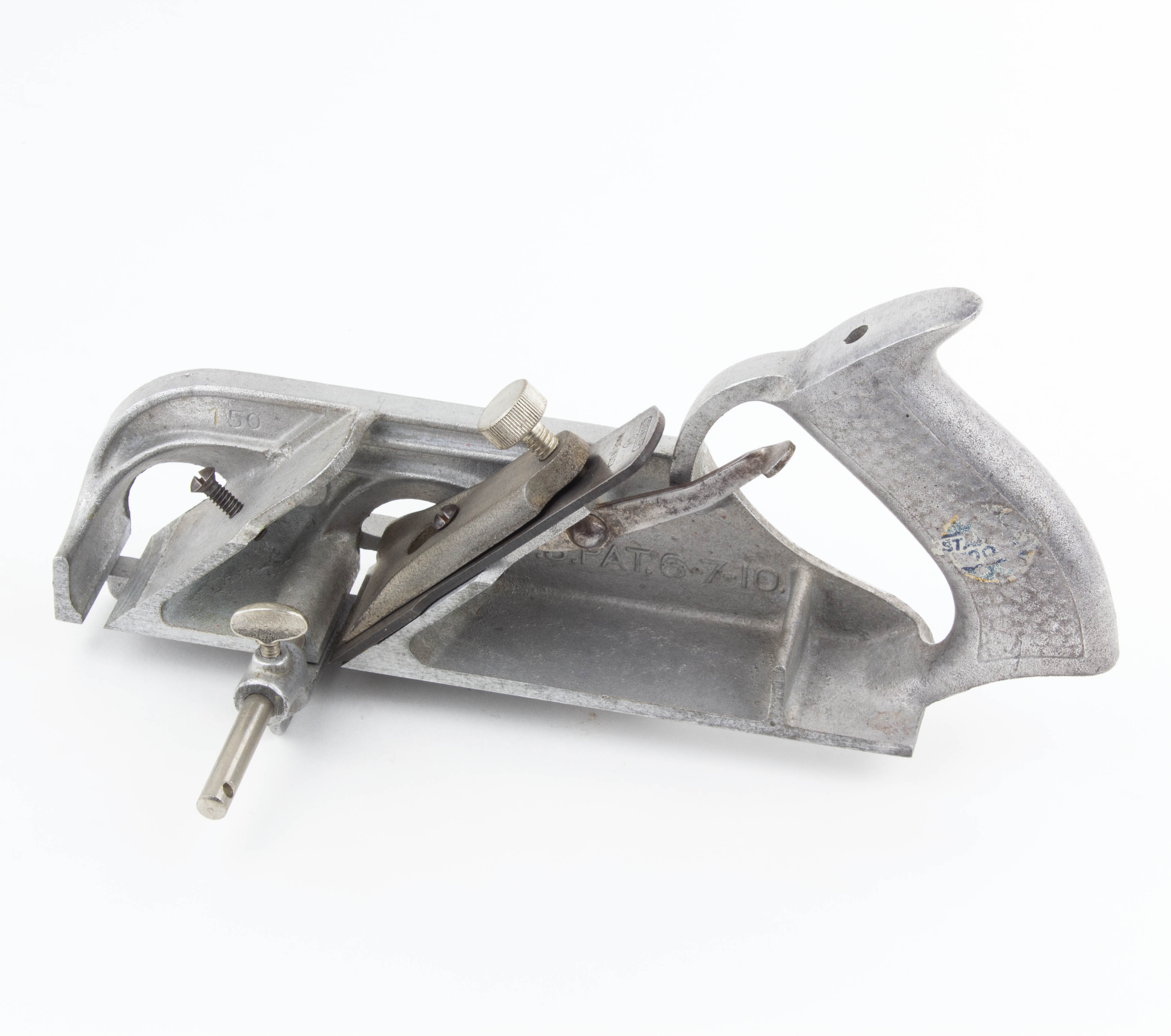 B68-7 ALUMINUM DUPLEX RABBET PLANE. Stanley No. A78. Sweetheart cutter. Complete with original fence and depth stop. Trace of decal on tote. Aluminum very clean with a few light scratches. From the collection of Jim and Becky Leamy. Good+ 150-300