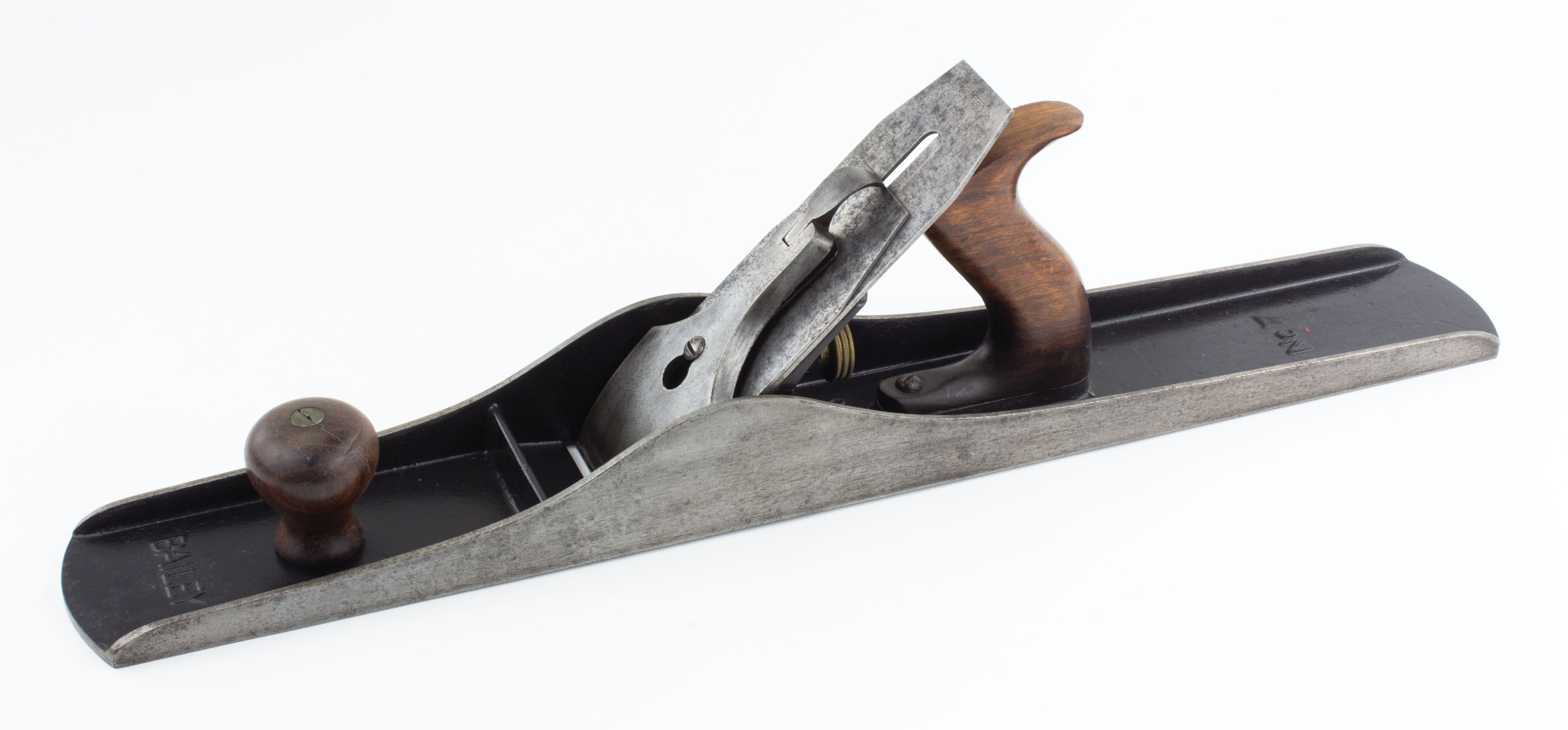 B68-11 CORRUGATED SOLE JOINTER PLANE. Stanley No. 7C. Type 11 with sweetheart cutter. Japanning intact, wood clean. Cutter has surface corrosion, nickel plating on lever cap 75%. From the collection of Jim and Becky Leamy. Good + 75-150