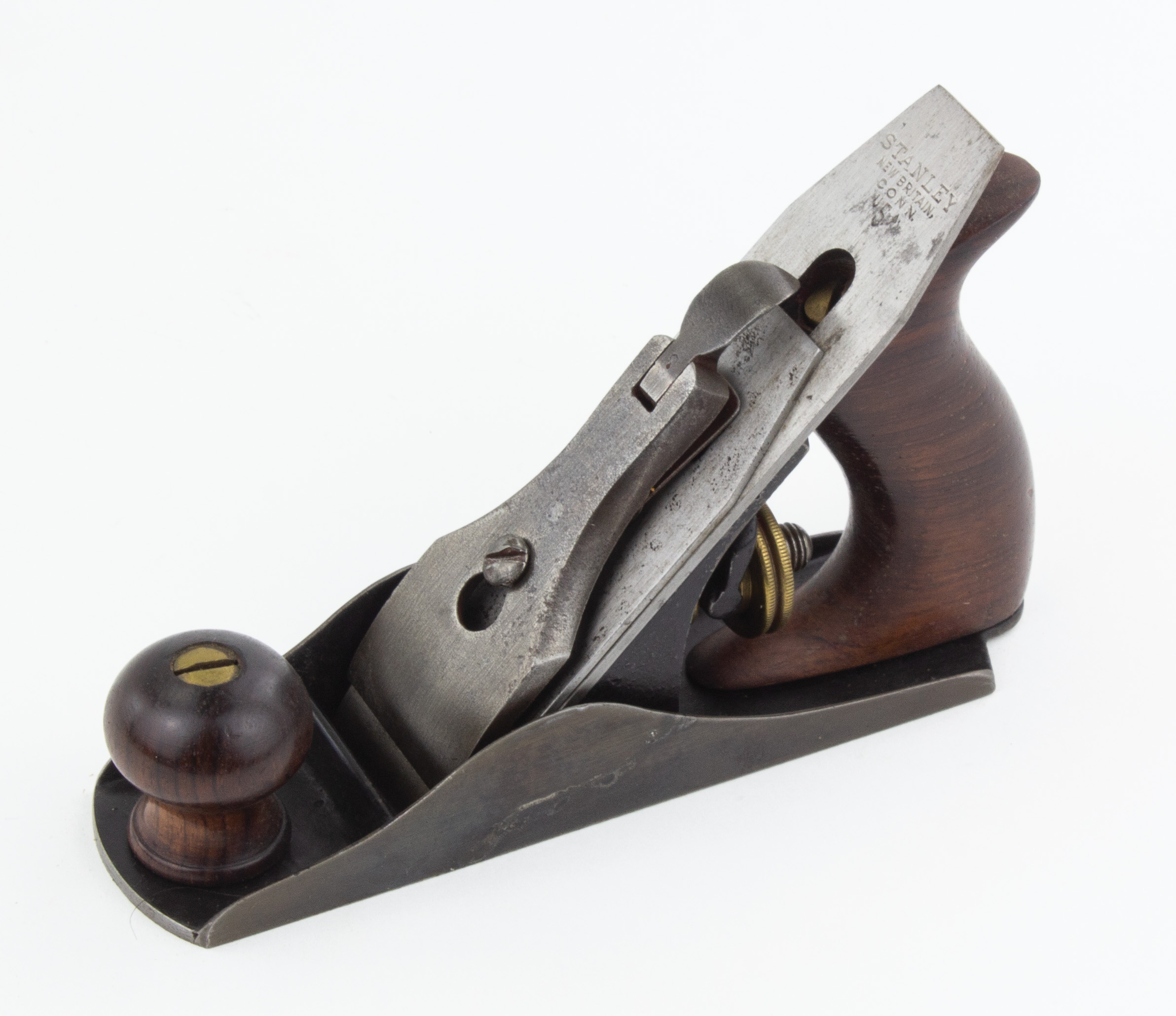 B68-25 NUMBER ONE SIZE PLANE. Stanley No. 1. Low knob, vee mark on cutter with a few spots of light pitting, B mark behind frog. Japanning intact, wood very clean. Unfortunately has cracks in both cheeks. From the collection of Jim and Becky Leamy. Good- 400-800