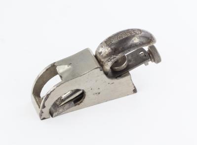 B68-29 BULLNOSE RABBET PLANE. Stanley No. 90A. Super rare variation on the No. 90 rabbet plane with one-piece body and nonadjustable throat. Made in USA, notched rectangle cutter. Nickel plating 75%. From the collection of Harold Unruh. Good 400-800