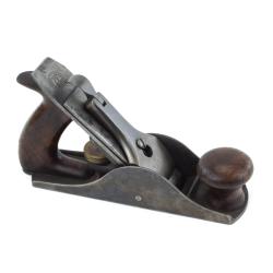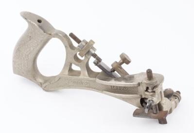 B68-30 CURVED RABBET PLANE. Stanley No. 196. Early type with script trademark. Proper cutter, all parts. Nickel 90% with no peeling and reasonably shiny, sweetheart cap screw. Decent example of one of Stanley's rarest special purpose planes. From the collection of Harold Unruh. Good+ 400-800