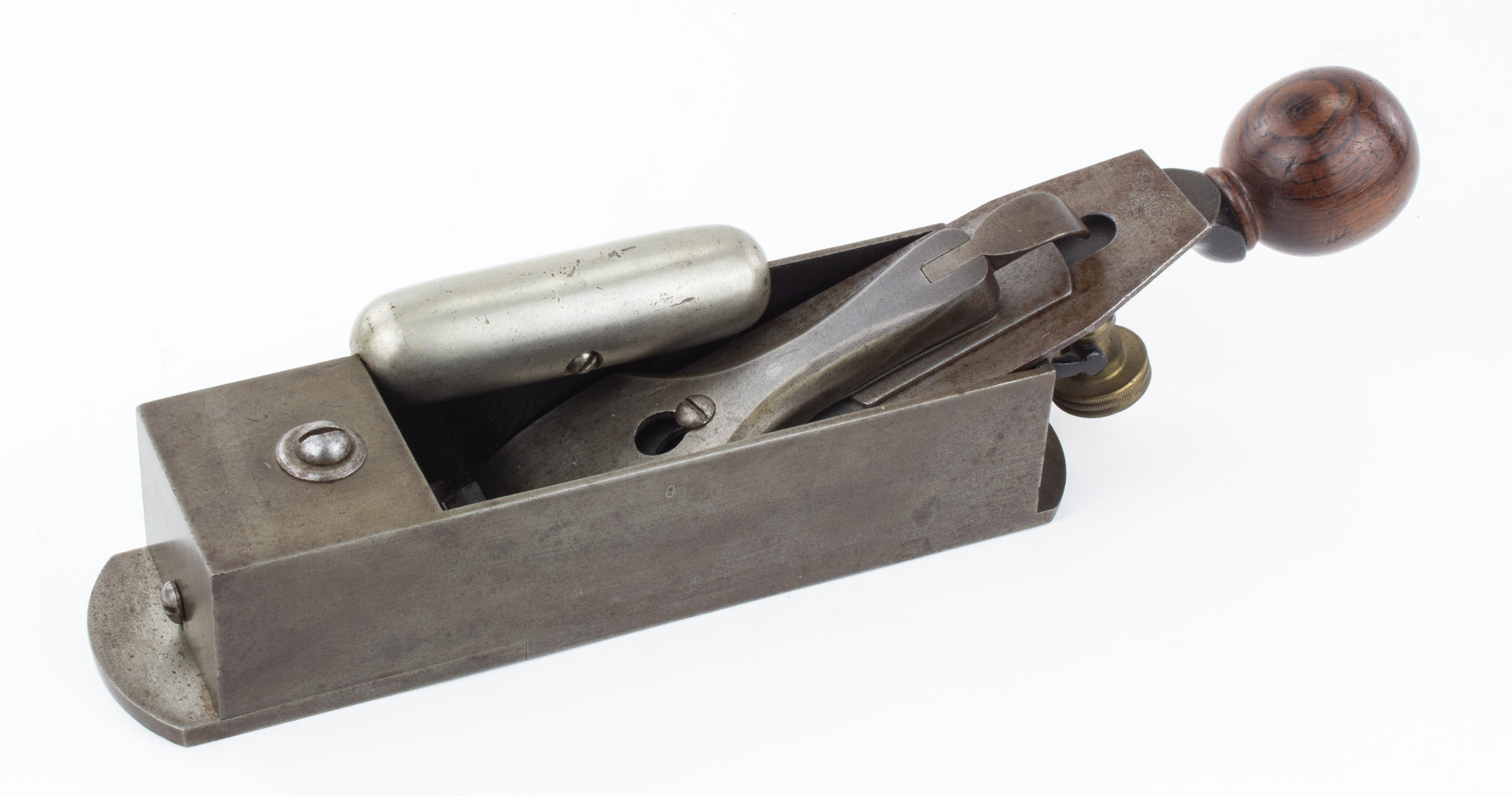B68-35 CABINETMAKER'S BLOCK PLANE. Stanley No. 9. Later type, vee mark on cutter, good knob. Includes original hot dog. Japanning 95%. Wood and metal very clean. From the collection of Harold Unruh. Good+ 600-1200