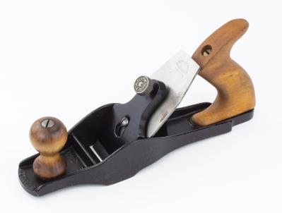 B68-39 FURRING PLANE. Stanley No. 340. Type 1 with "Patent Applied For" cutter. Japanning 99%, wood near perfect with a couple of tiny chips from tote. A tough plane to find in anything like decent shape and this one is like new. Fine 500-1000