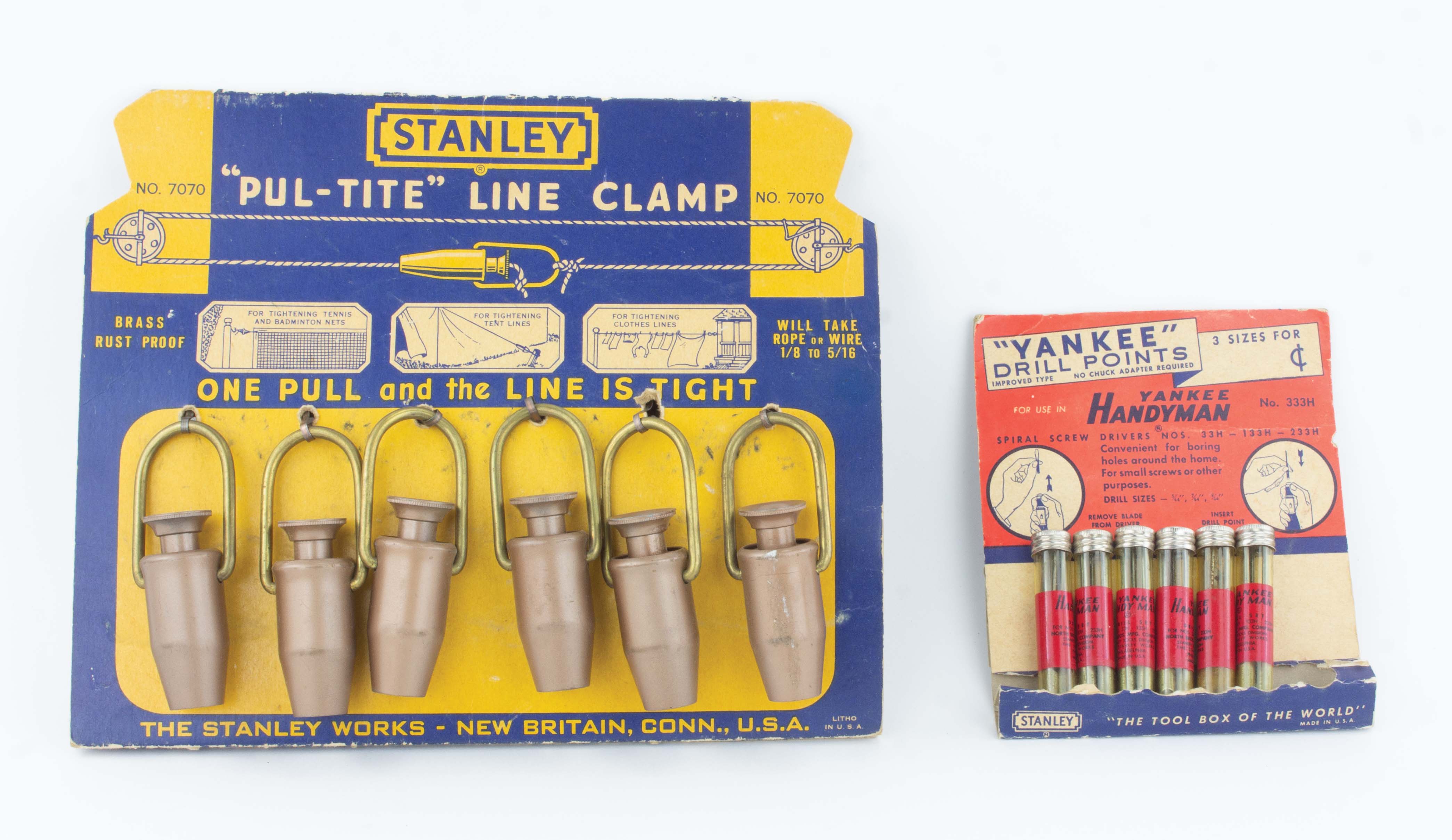 B68-42 LOT OF TWO HARDWARE DISPLAYS. Stanley. Set of twelve brass "Pul-Tite" No. 7070 line clamps on original 10" x 8" cardboard stand, clamps line both sides of blue and yellow printing, slight wear along top fold. And a set of six Yankee drill points in original plastic tubes, held on 6" x 5" original cardboard stand that is torn along base but with printing intact. From the collection of Jim and Christa Schoenky. Good & better 60-120