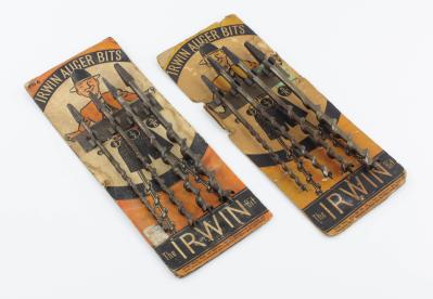 B68-43 LOT OF TWO HARDWARE DISPLAYS. Irwin Auger Bits. Both have four bits held by metal clamps attached to cardboard stand, both worn and stained, 12" x 4-1/2", one more intact than the other. Bits are oxidized but clean and sharp. From the collection of Jim and Christa Schoenky. Good 50-100
