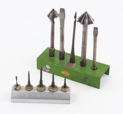 B68-45 LOT OF TWO BIT DISPLAYS. Stanley. Five screwdriver blades in green japanned metal stand with intact decal on front. Plus five countersink bits marked "Screw-Mate Set No. 1525-B" on 4" aluminum base with patent date. Bits are good, mild wear to bases but overall clean. From the collection of Jim and Christa Schoenky. Good+ 50-100