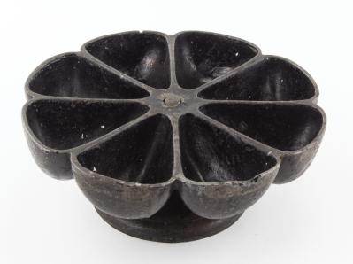 B68-49 NAIL CUPS. Tru-Fit. All cast iron, eight compartments, 9-1/2" in diameter, on base with "Tru-Fit" cast into it. Japanning 60% and one compartment has chip on rim otherwise nice and clean. Good+ 100-200