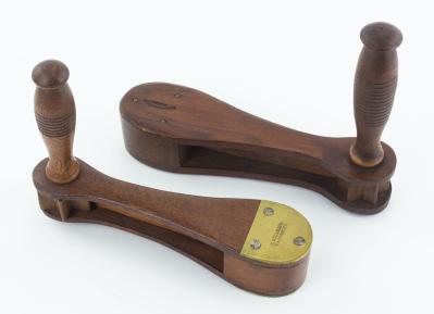 B68-50 LOT OF TWO WOODEN CLACKERS. Philadelphia Makers. Both look like mahogany with turned side handles that you grip and twirl the body which rotates a wooden wheel to create loud clacking noise. One is marked E. Mills & Co. on brass plate, the other is marked Bagshaw & Field. Used frequently by police or law enforcement before the widespread use of whistles. Both clean and work well. From the collection of Carl Bopp. Good+ 100-200