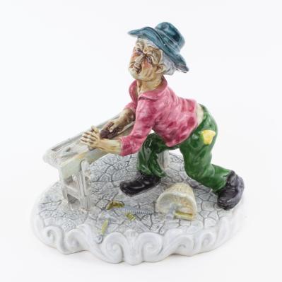 B68-52 CERAMIC OCCUPATIONAL FIGURE. Carpenter at Workbench. 10" wide base depicting a carpenter at a workbench using a horn plane. Carpenter is wearing a red shirt, green pants, and blue hat, and a basket with a hammer is beside him. 9-1/2" tall, a few tiny chips, otherwise nice and clean. Good+ 100-200