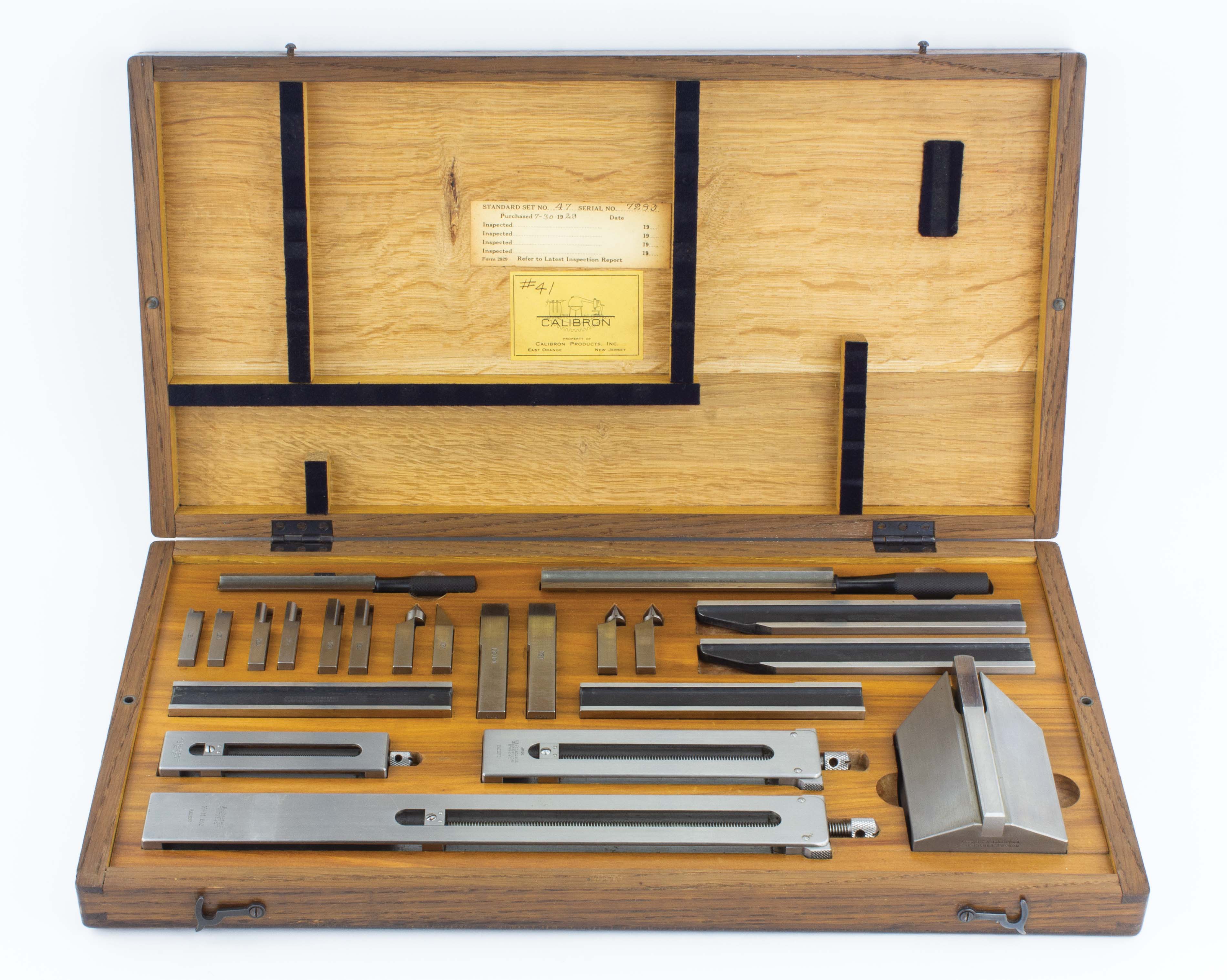 B68-57 PRECISION GAGE BLOCK HOLDER AND ACCESSORY SET IOB. C. E. Johansson No. K-M 200. Swedish maker, complete set in original box with Calibron Products label on inside lid. Clean and near mint. From the collection of Jim and Becky Leamy. Fine 250-500