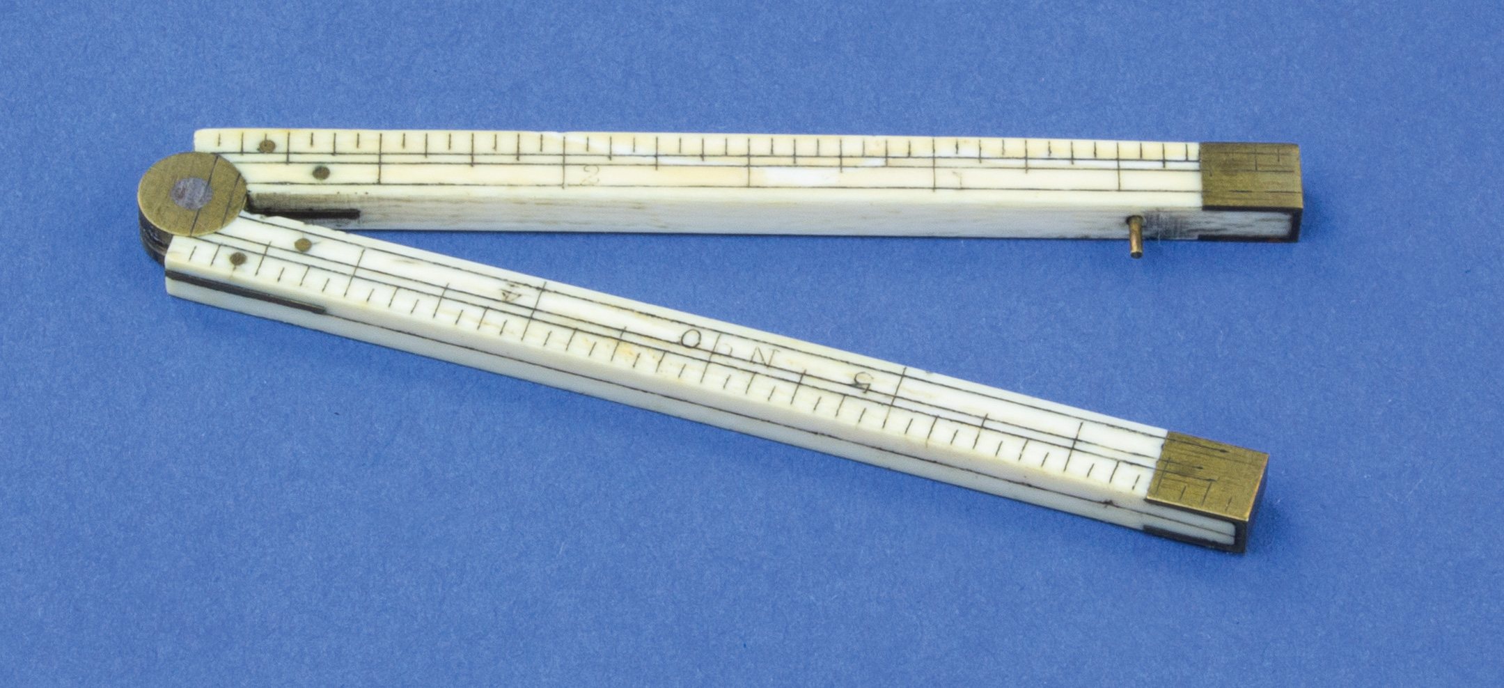 B68-63 IVORY RULE. Stanley No. 0. Two-fold, six inch, German silver trim and round hinge. The No. 0 and No. 00 rules were never listed in any Stanley catalog, were too small to be of practical use, and were probably made out of scrap pieces of ivory as promotional items. Lightly yellowed, good pin. From the collection of David Jeffers. Good+ 300-600