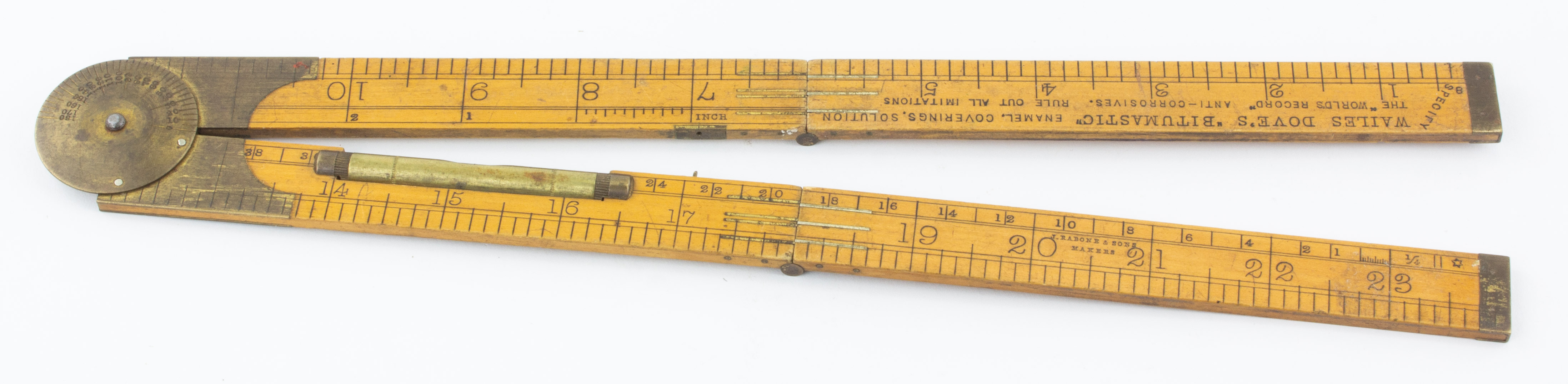 B68-70 COMBINATION LEVEL RULE. J. Rabone & Sons. Four-fold two foot with level vial in one leg. Includes advertising mark for Wailes Dove's "Bitumastic" enamel. Wood is clean, brass lightly tarnished. Good + 60-120