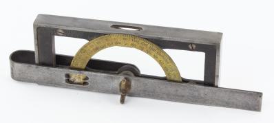 B68-71 COMBINATION SQUARE AND LEVEL. W.S. Batchelder. Actually patented by G.L. Chamberlin of Marietta, OH, but manufactured exclusively by Batchelder, who usually stamped them with his name and ignored Chamberlin. This is the version with u-shaped rotating arm marked only with the patent date. Very clean, level vial original. Fine 250-500