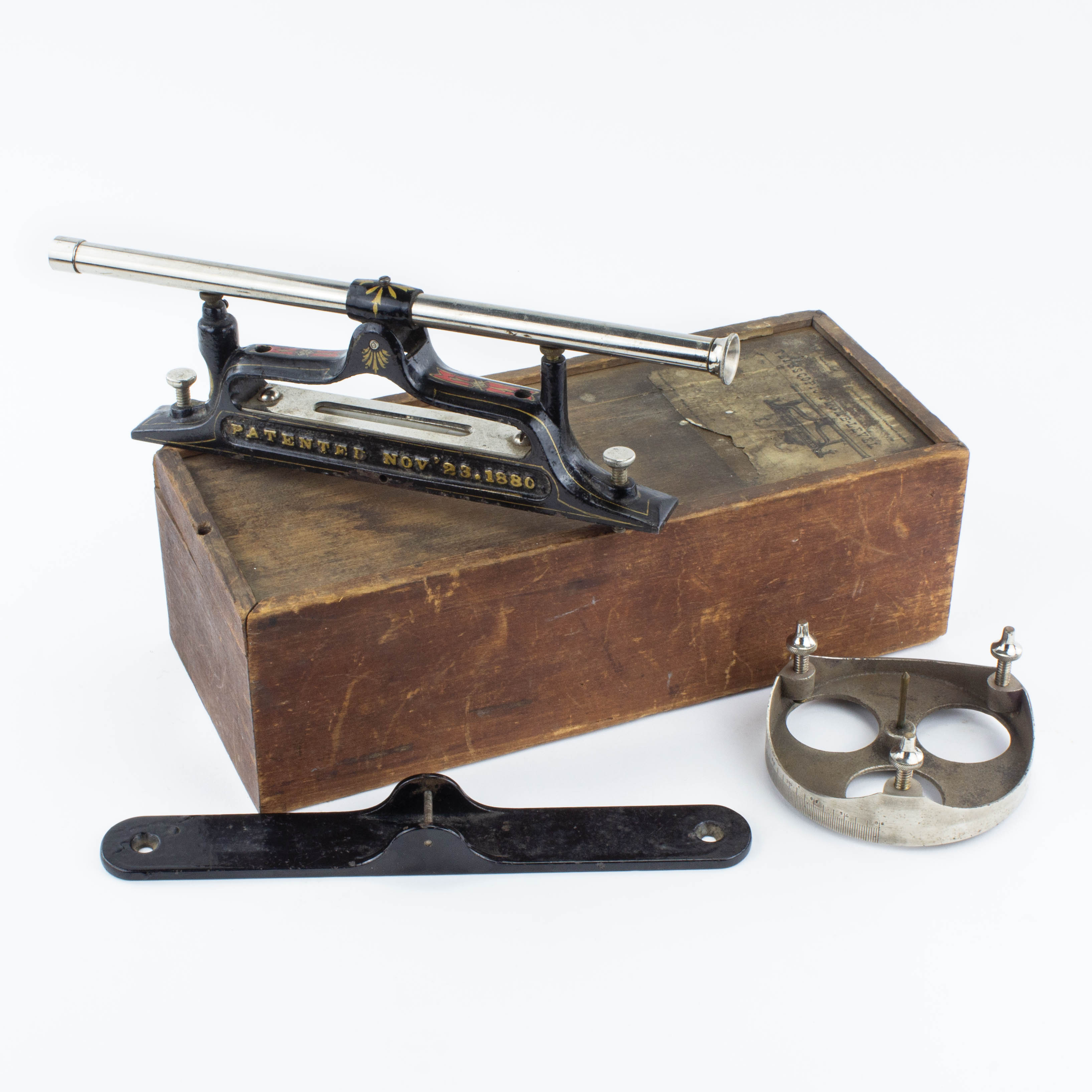 B68-75 SIGHTING LEVEL IOB. John W. Harmon. Harmon's "artificer's level," marked with his original 11/23/88 patent date. The japanning and pinstriping are near complete. Includes rotating base in original sliding wooden box with faded label. Harmon levels in their original box are extremely rare. Fine 500-1000