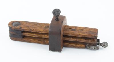 B68-79 SLITTING GAUGE. Unmarked and appears to be user made. Has three arms held by a sliding collet with iron plate at bottom, and a clamp at end of one arm with thumbscrew to presumably hold a slitter. 7" long, wood has moderate wear. Very unusual design. Good+ 100-200