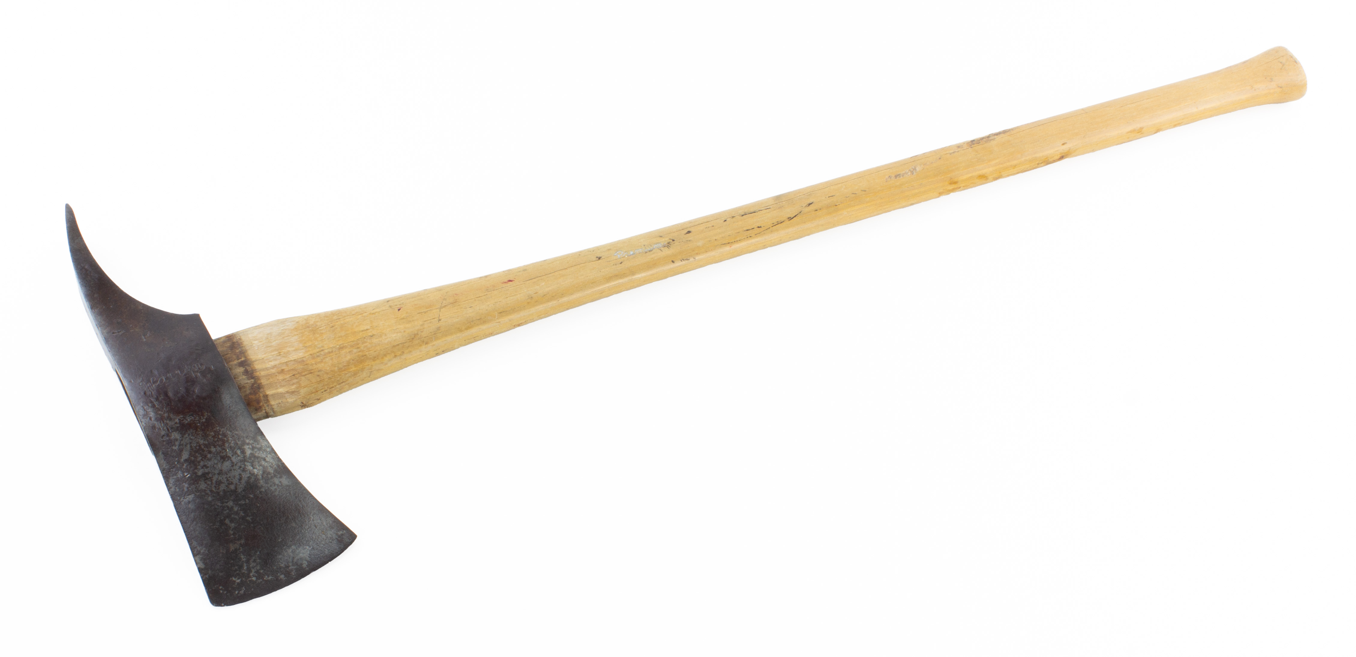 B68-85 UNDERCUTTER AXE. Warren. 13" head with 4" edge, 31-1/2" handle. Marked Warren in script lettering, overall clean. Undercutter axes were used in logging areas to "bash out" the waste wood in a felling notch where a crosscut saw could not be used. Good+ 50-100
