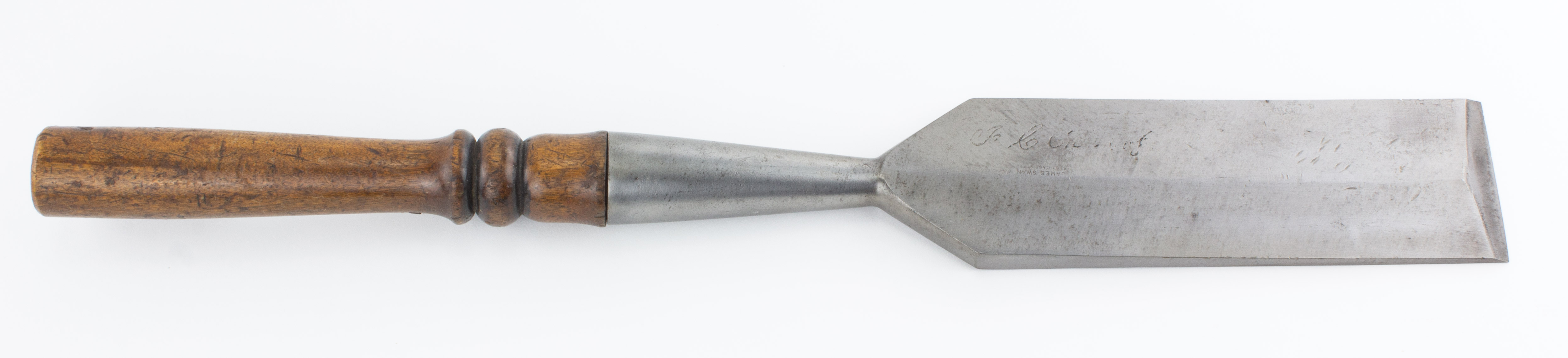 B68-86 SLICK. James Swan. 3" edge, original handle has been shortened to 9", overall 24" long. Very clean with user name etched in blade, clear maker stamp. From the collection of David Jeffers. Good+ 100-200