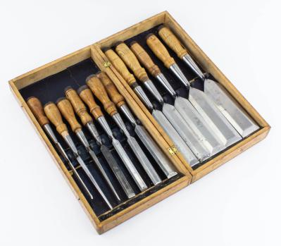 B68-88 CHISEL SET IOB. Jennings & Griffin Mfg. Co. No. 6. Twelve bevel edge chisels from 1/8" to 2" in width, original socket handles, but not all the same profile. All marked with Jennings & Griffin Mfg. No. 6 on blades except one marked just C.E. Jennings with diamond stamp that is also on several other blades. All inside folding wooden box, 16-1/2" x 9", with traces of label on outside but looks original, crack in lid. Inside has 70% black label showing widths only, no maker mark. Most chisels very clean, a few have light oxidation, mild wear to handles. Good+ 300-600